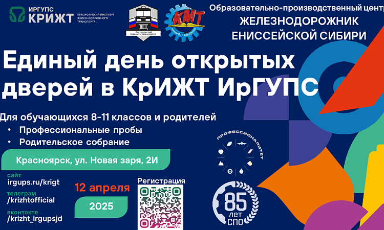 С нетерпением ждем вас на Едином дне открытых дверей кластера «ЖЕЛЕЗНОДОРОЖНИК ЕНИСЕЙСКОЙ СИБИРИ», который состоится в КрИЖТ ИрГУПС уже скоро – 12 апреля!