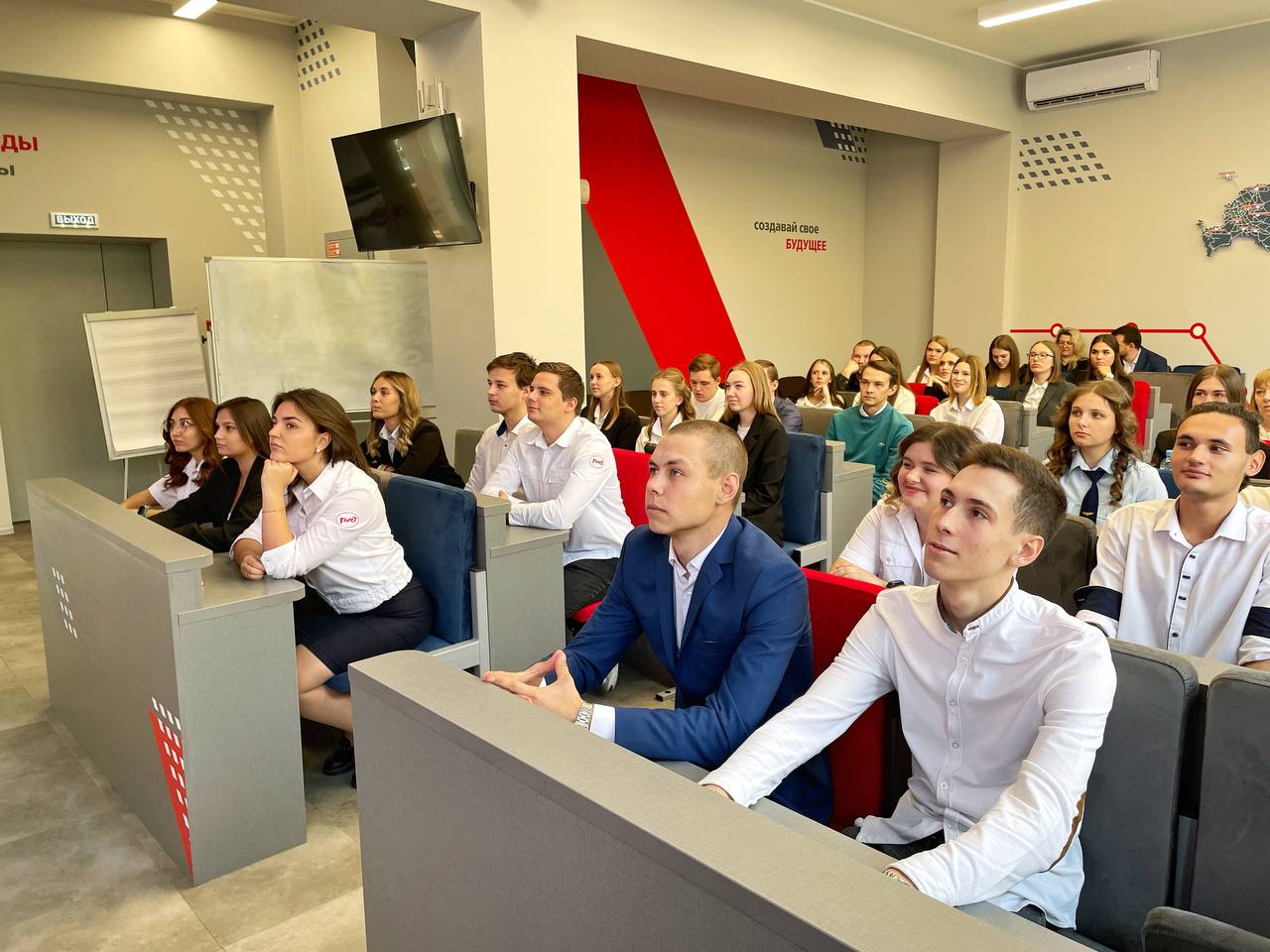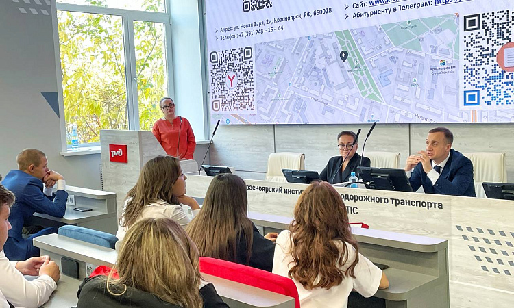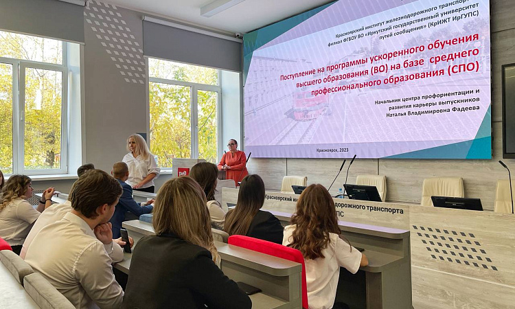 12 октября состоялась профориентационная встреча студентов СПО выпускных курсов групп ЭЛС.11-21-1, М.11-21-1 и Э.11-22-1 с директором КрИЖТ ИрГУПС Евгением Савченко и представителями ВО, в лице начальника ЦПРК Натальи Фадеевой, зав. кафедрой «Управление персоналом» Виталия Колмакова и декана факультета «Очное обучение» Альбины Даниловой.
