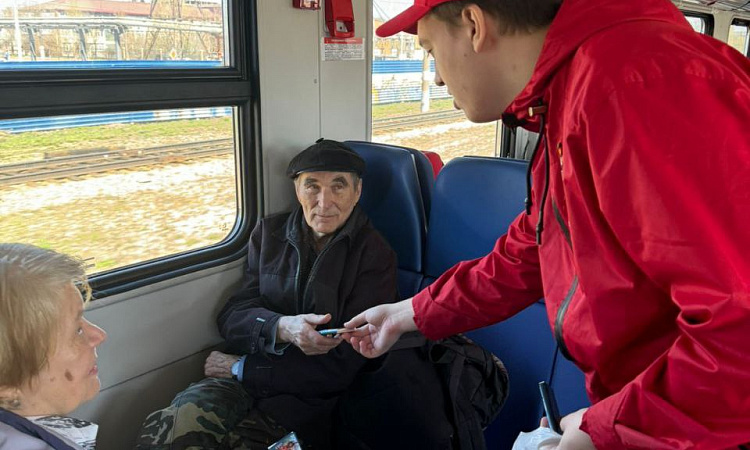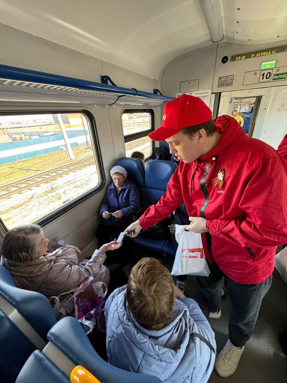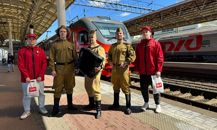 Песни, любимые многими поколениями, музыканты спели в образе выездного творческого коллектива, который во время Великой Отечественной войны гастролировал в местах расположения действующих частей Красной Армии и поднимал боевой дух наших солдат под аккомпанемент народных инструментов. Волонтеры поздравили пассажиров с наступающим праздником Днем Победы и подарили всем сладкие сувениры.