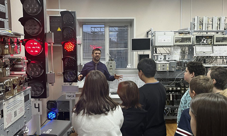 С помощью обучающего тренажера, который предназначен для изучения сигнализации на Входном и Выходном светофорах, ознакомились с принципом действия схем управления этими светофорами.