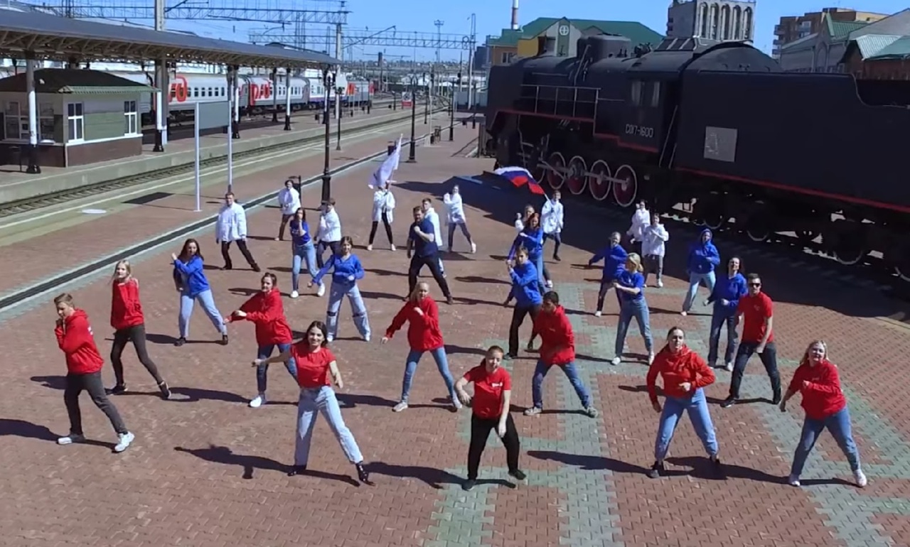 На пассажирской платформе станции Красноярск ребята в футболках цветов российского флага танцевали, заряжая своим позитивом пассажиров.
