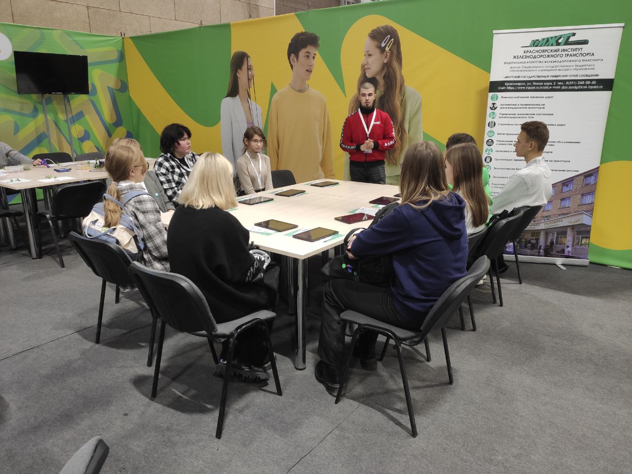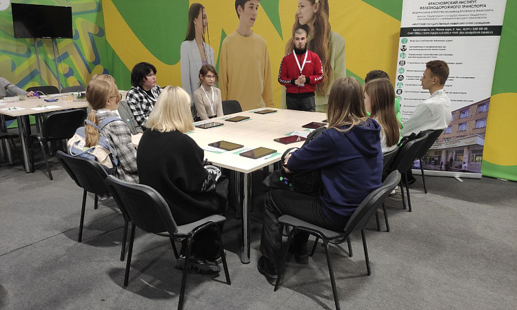 А с 9 по 11 ноября в рамках "Билета в будущее" проходил "Фестиваль профессий" в МВДЦ "Сибирь". За три дня фестиваль посетило более тысячи школьников Красноярского края. Каждый день гости мероприятия проходили профессиональные пробы, в том числе организованные Красноярским институтом железнодорожного транспорта. На этих пробах мы погружали школьников в железнодорожную профессию через приложение-симуляцию на планшетах, на которой был отражен полный рабочий процесс разгрузки цистерны с нефтью, начиная от выбора средств индивидуальной защиты работника, заканчивая химической пробой образца нефти. Очень гордимся тем, что это обучающее приложение полностью разработано работником КрИЖТ - Евгением Бойковым (p.s. если хотите научиться разрабатывать приложения, то можно записаться к Евгению Викторовичу в его технологические кружки).