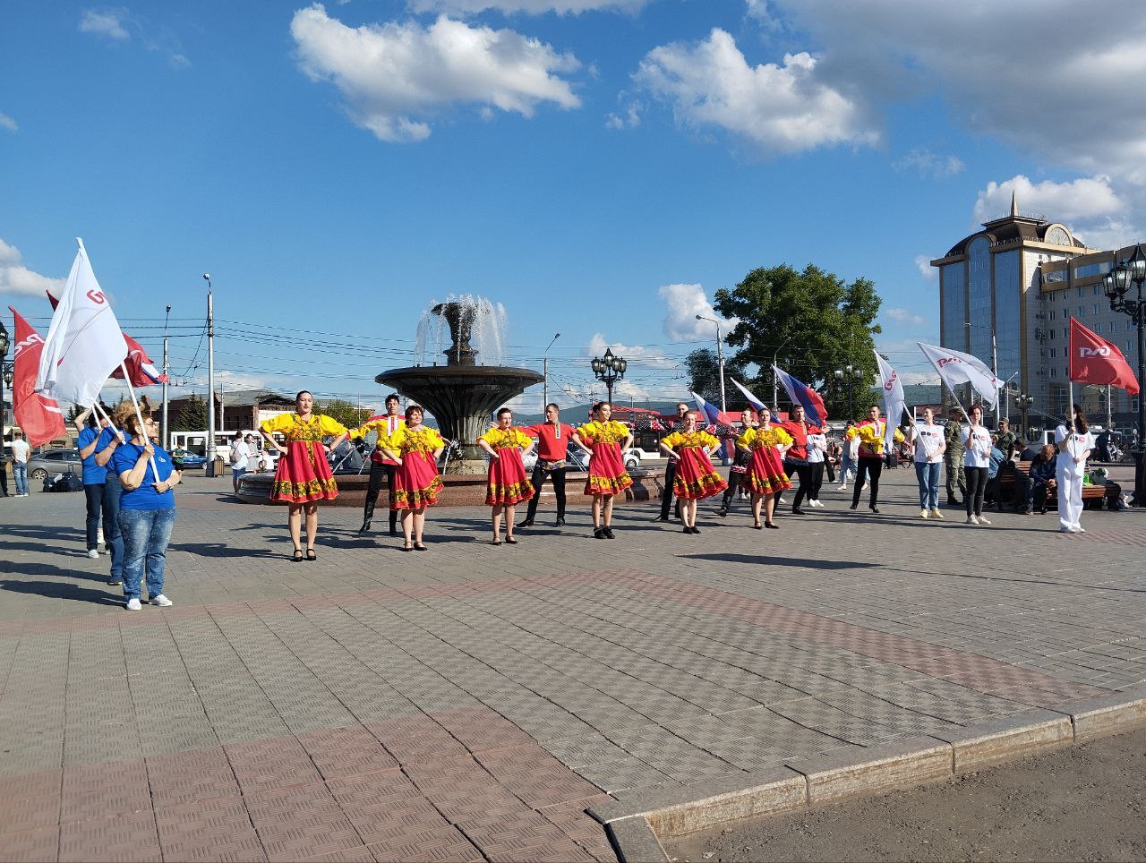 Сотрудники исполнили народный танец, после чего «серебряные» волонтеры совместно со студентами КрИЖТ приняли участие в построении дальнейшей программы танца, неся в руках флаги родной страны и компании «РЖД».