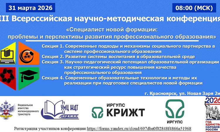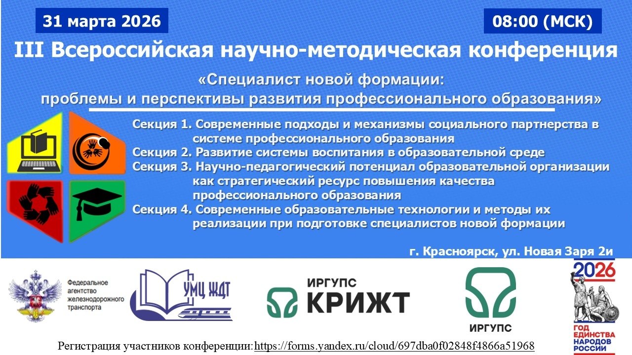 31 марта 2026 на базе Красноярского техникума железнодорожного транспорта состоится III Всероссийская научно-методическая конференция «Специалист новой формации: проблемы и перспективы развития профессионального образования».