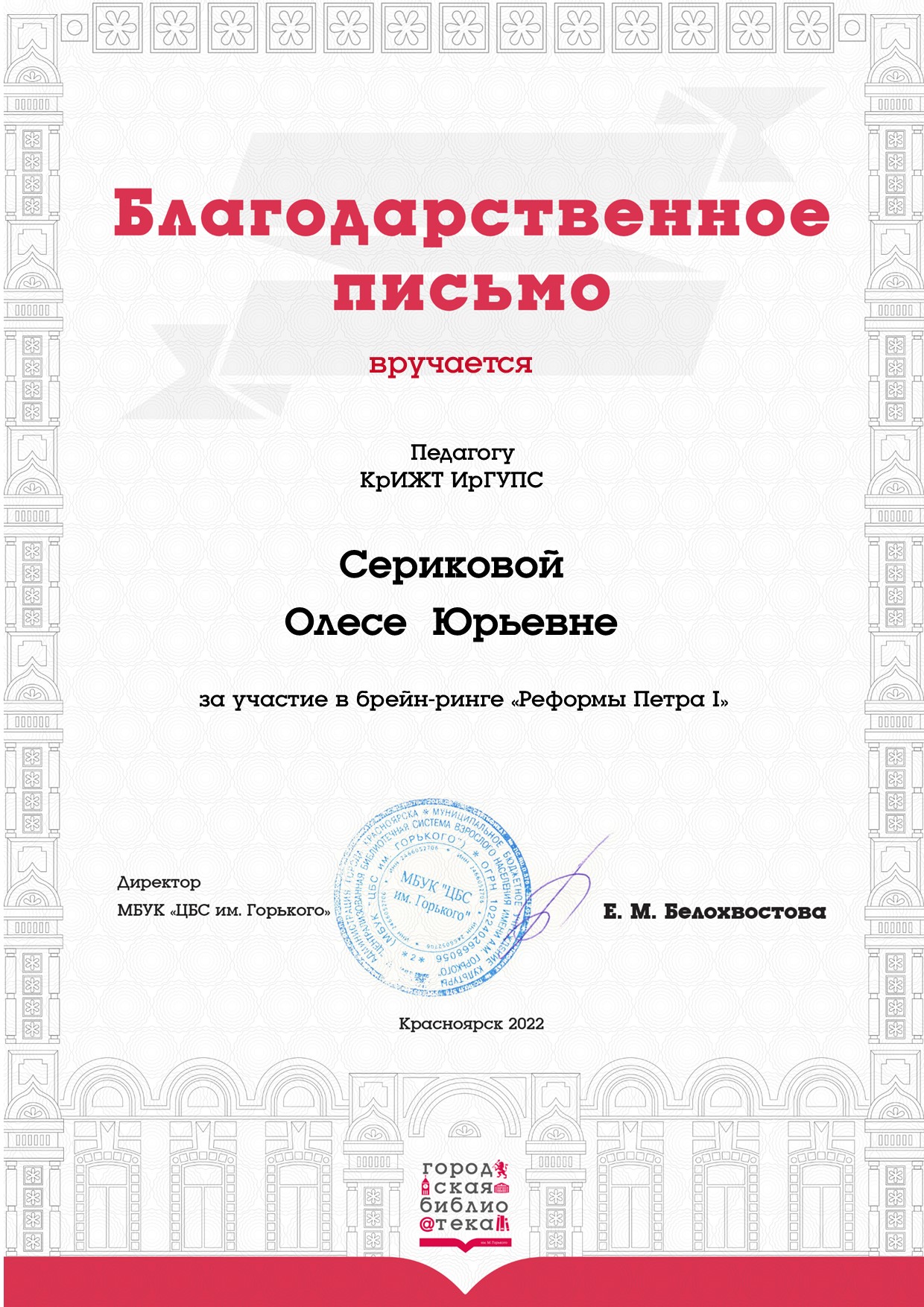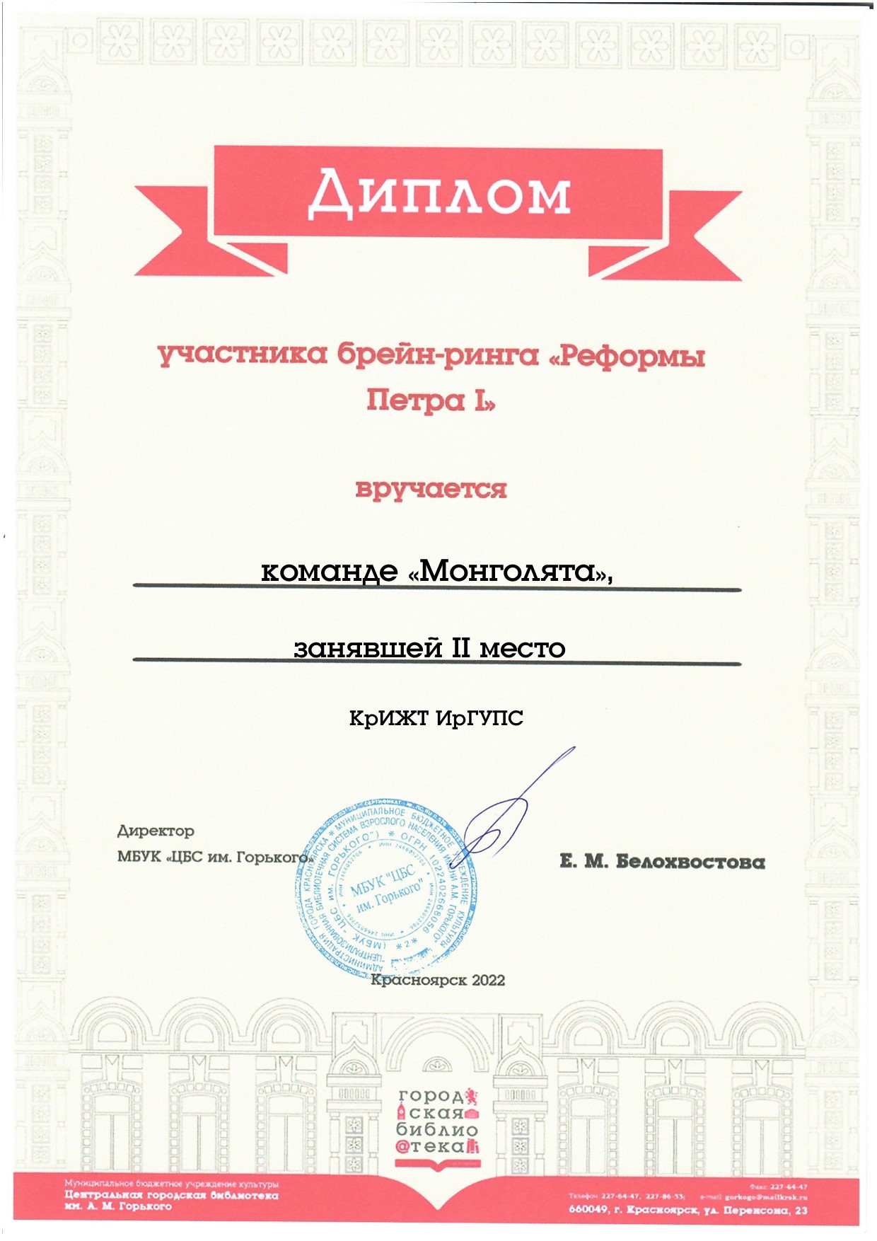 28.11.2022 в Центральной городской библиотеке им. А.М. Горького команда из студентов 1 курса КрИЖТ ИрГУПС кафедры «Управление персоналом» (руководитель - старший преподаватель Серикова О.Ю.) заняла 2 место среди участвующих команд , в интеллектуальная игре брейн-ринг «Реформы Петра I», приуроченный к 350-летию со дня рождения великого реформатора.