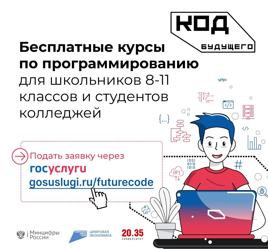 Российские школьники 8-11 классов и студенты колледжей могут бесплатно выучить языки программирования в рамках проекта «Код будущего». Приём заявок на 2023-2024 учебный год стартовал на Госуслугах
