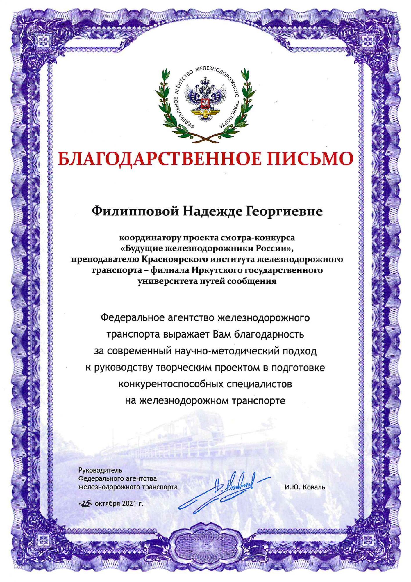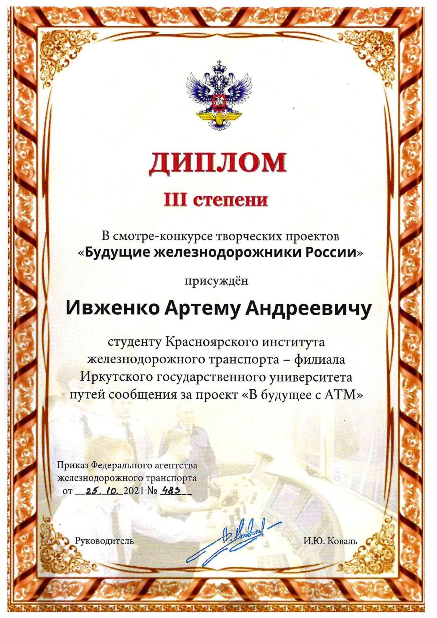 По итогам III (заключительного) этапа ДИПЛОМ III степени получил студент Красноярского техникума железнодорожного транспорта Ивженко Артем Андреевич за проект «В будущее с АТМ», который разработал под руководством преподавателя СПО Филипповой Надеждой Георгиевной. Артем обучается на четвертом курсе на специальности 27.02.03 Автоматика и телемеханика на транспорте (железнодорожном транспорте).