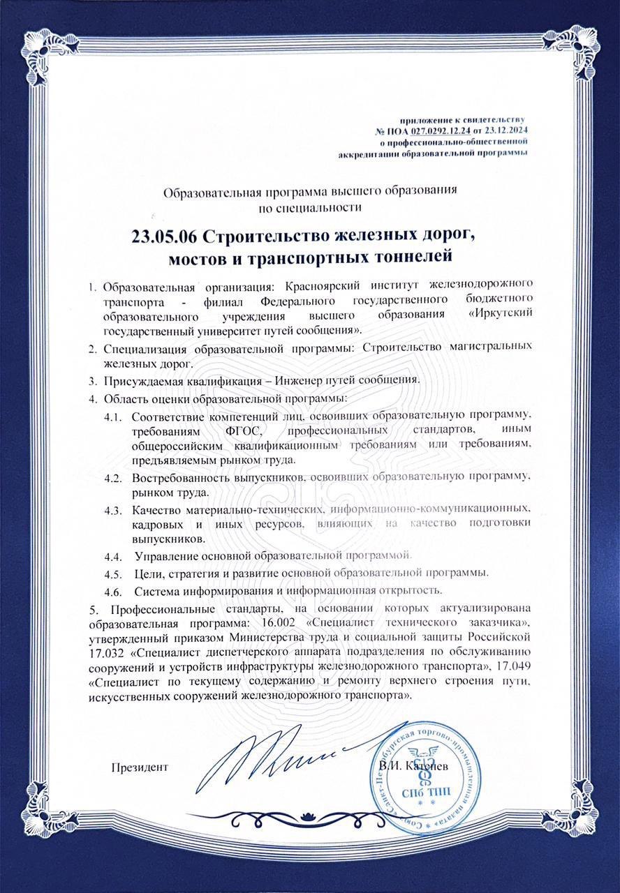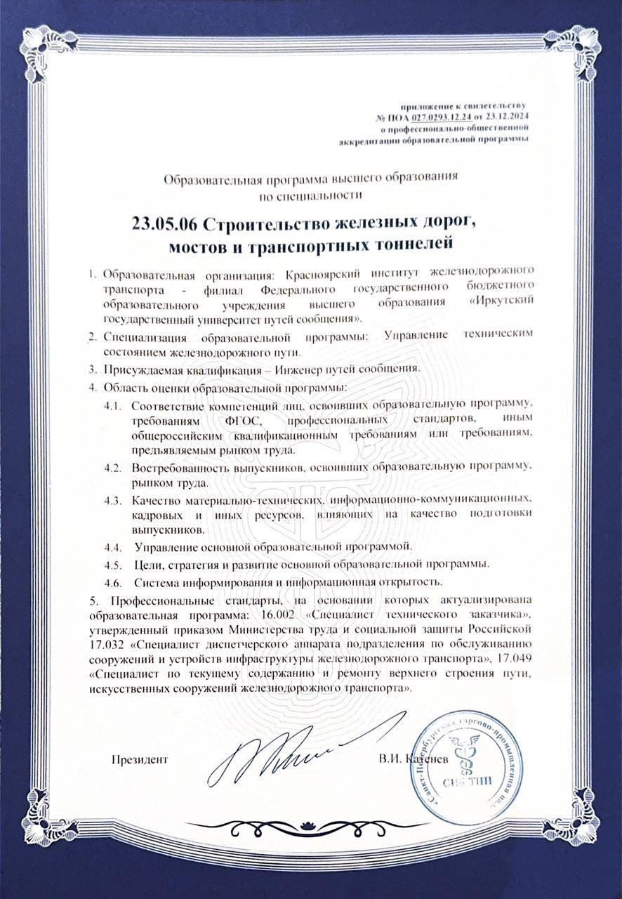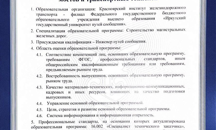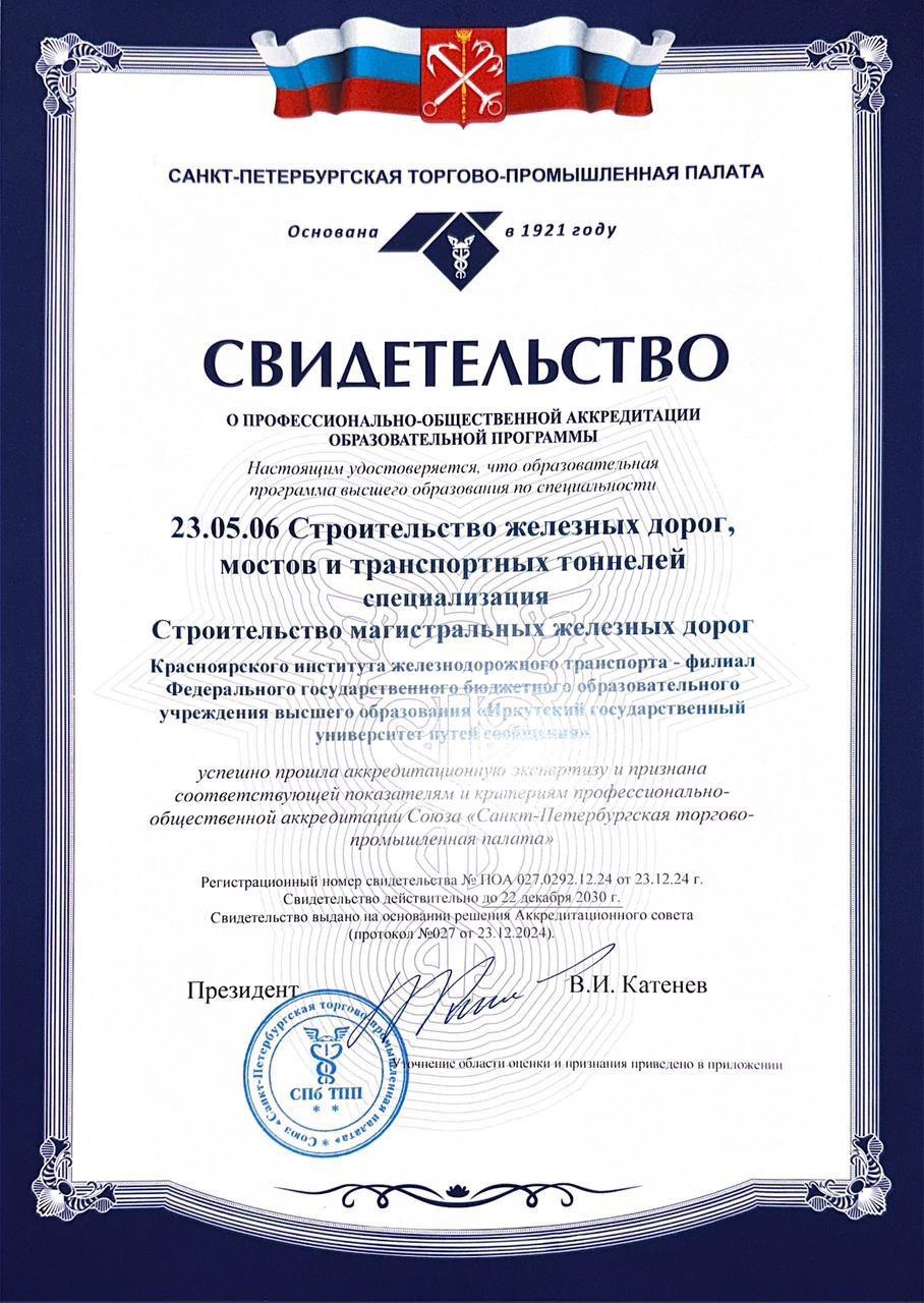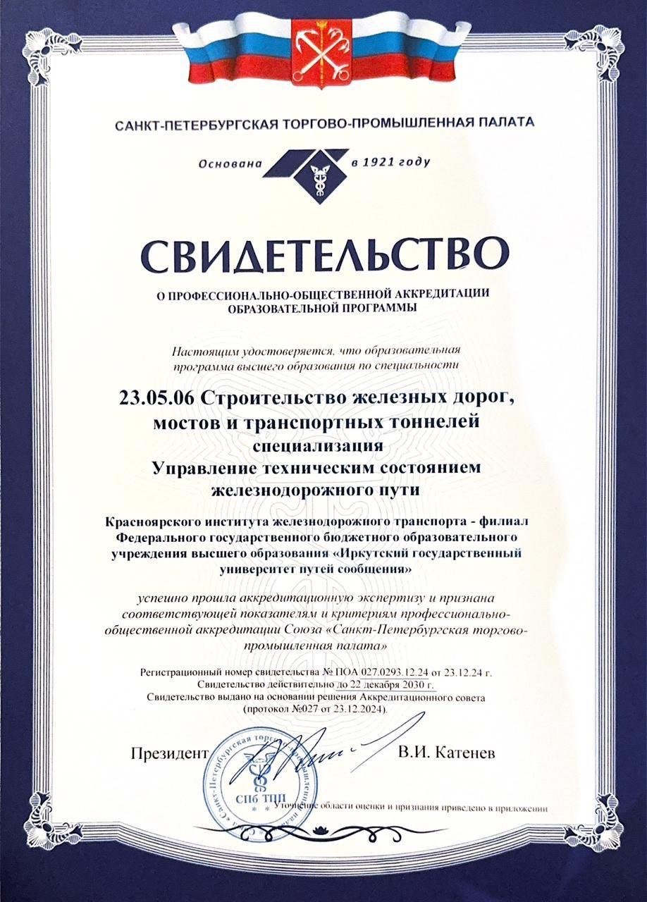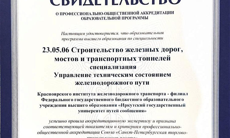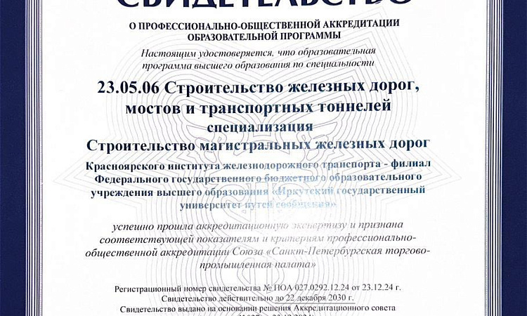 Под конец 2024 года мы спешим с приятной новостью! КрИЖТ ИрГУПС прошел профессионально-общественную аккредитацию Союза экспертов "Санкт-Петербургская торгово-промышленная палата" по программам «Строительство железных дорог, мостов и транспортных тоннелей. Управление техническим состоянием железнодорожного пути» и «Строительство железных дорог, мостов и транспортных тоннелей. Строительство магистральных железных дорог».