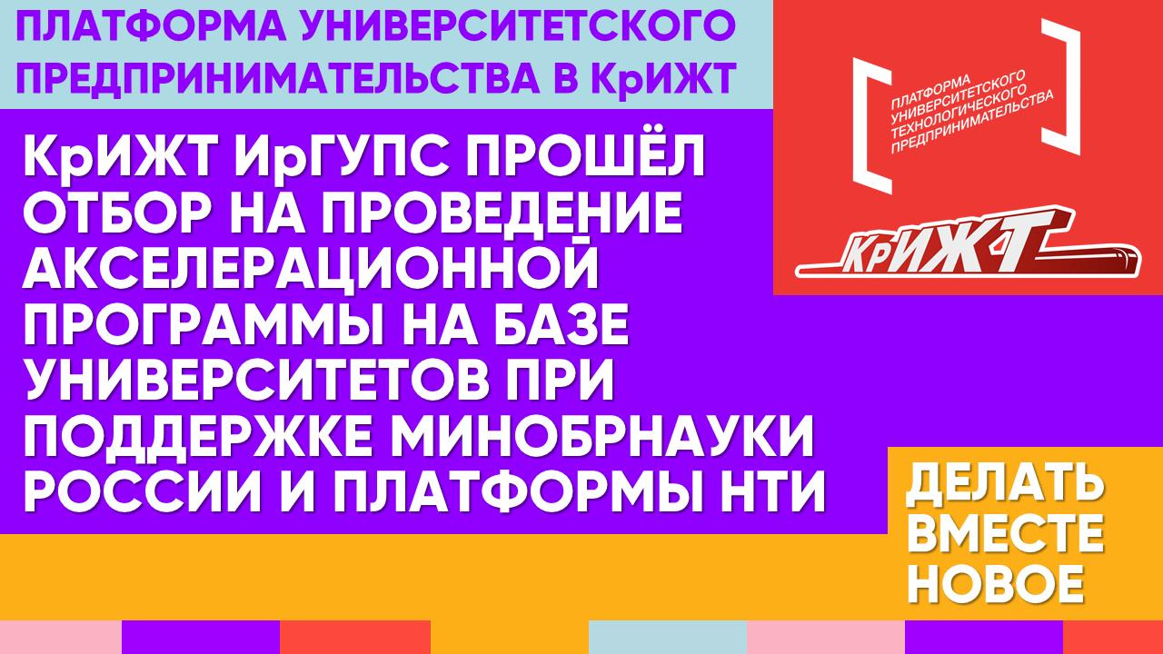 КрИЖТ ИрГУПС прошёл отбор среди 166 российских организаций, подавших заявки на проведение акселерационной программы на базе университетов при поддержке МИНОБРНАУКИ России и платформы НТИ. КрИЖТ выступит организатором акселерационной программы в рамках федерального проекта «Платформа университетского технологического предпринимательства».
