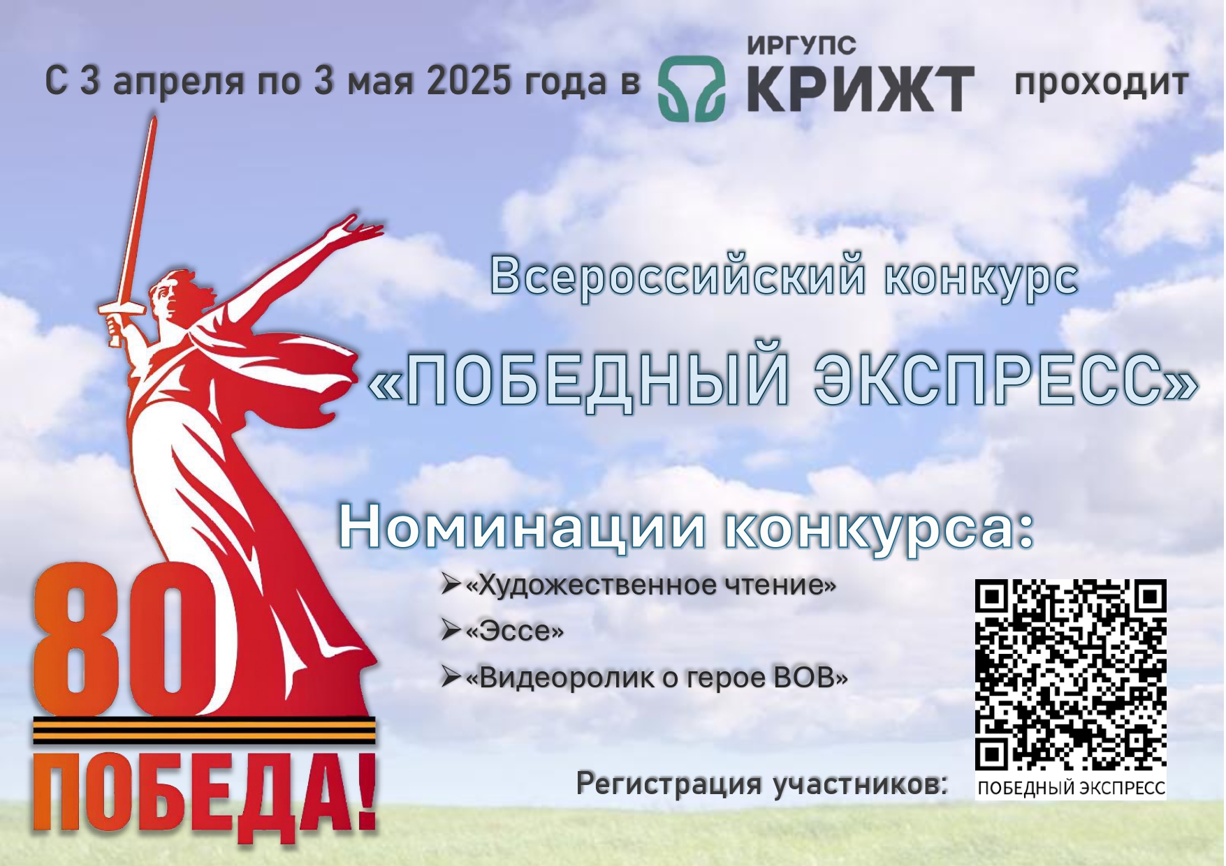 С 3 апреля по 3 мая 2025 года КрИЖТ проводит Всероссийский конкурс «Победный экспресс», посвященный 80-летию Победы в Великой Отечественной Войне.