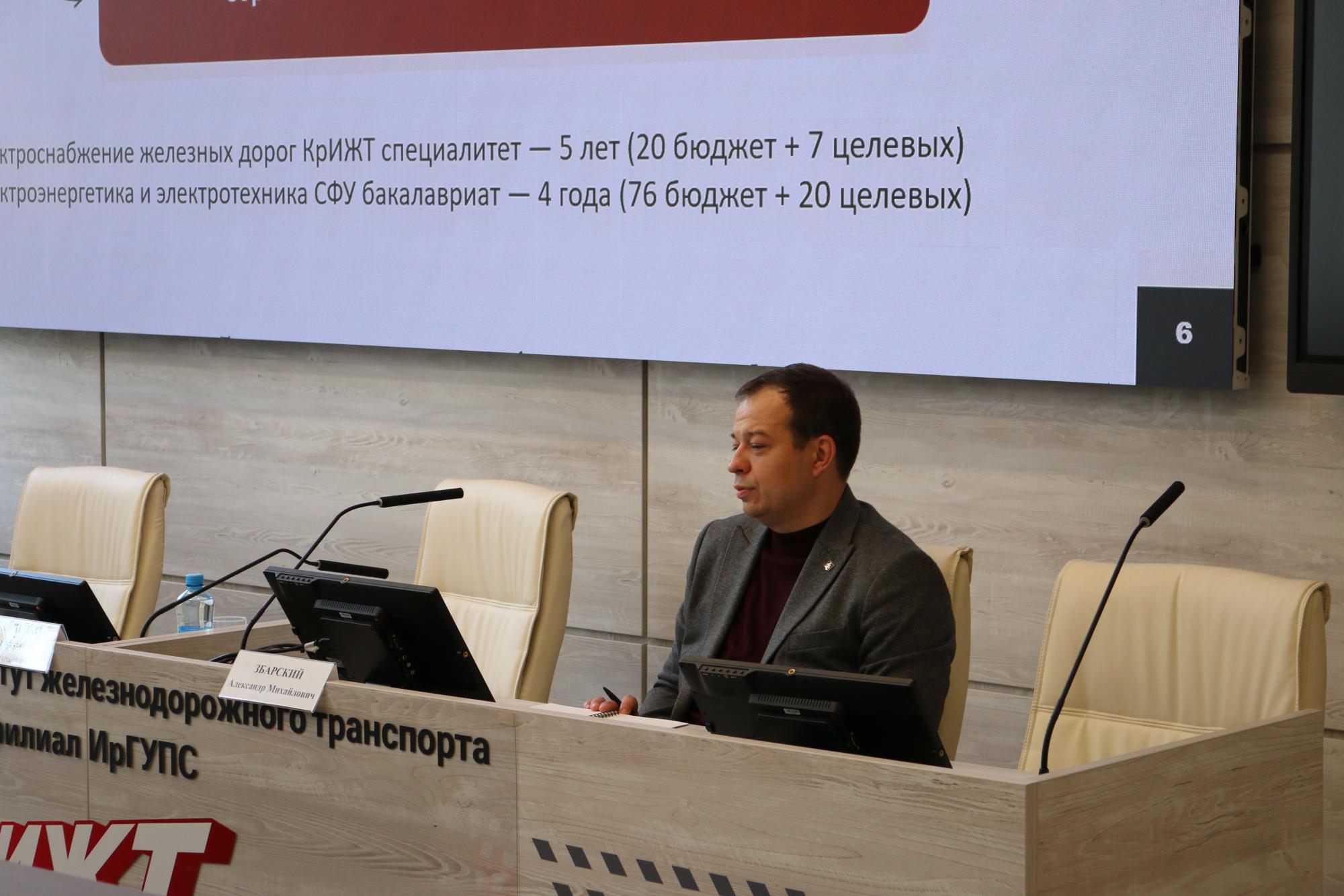 Председателем и организатором совещания выступил Александр Збарский, заместитель начальника департамента управления персоналом ОАО «РЖД». Также в совещании приняли участие директор КрИЖТ Евгений Савченко, представители Красноярской железной дороги, ИрГУПС и Приволжского ГУПС.
