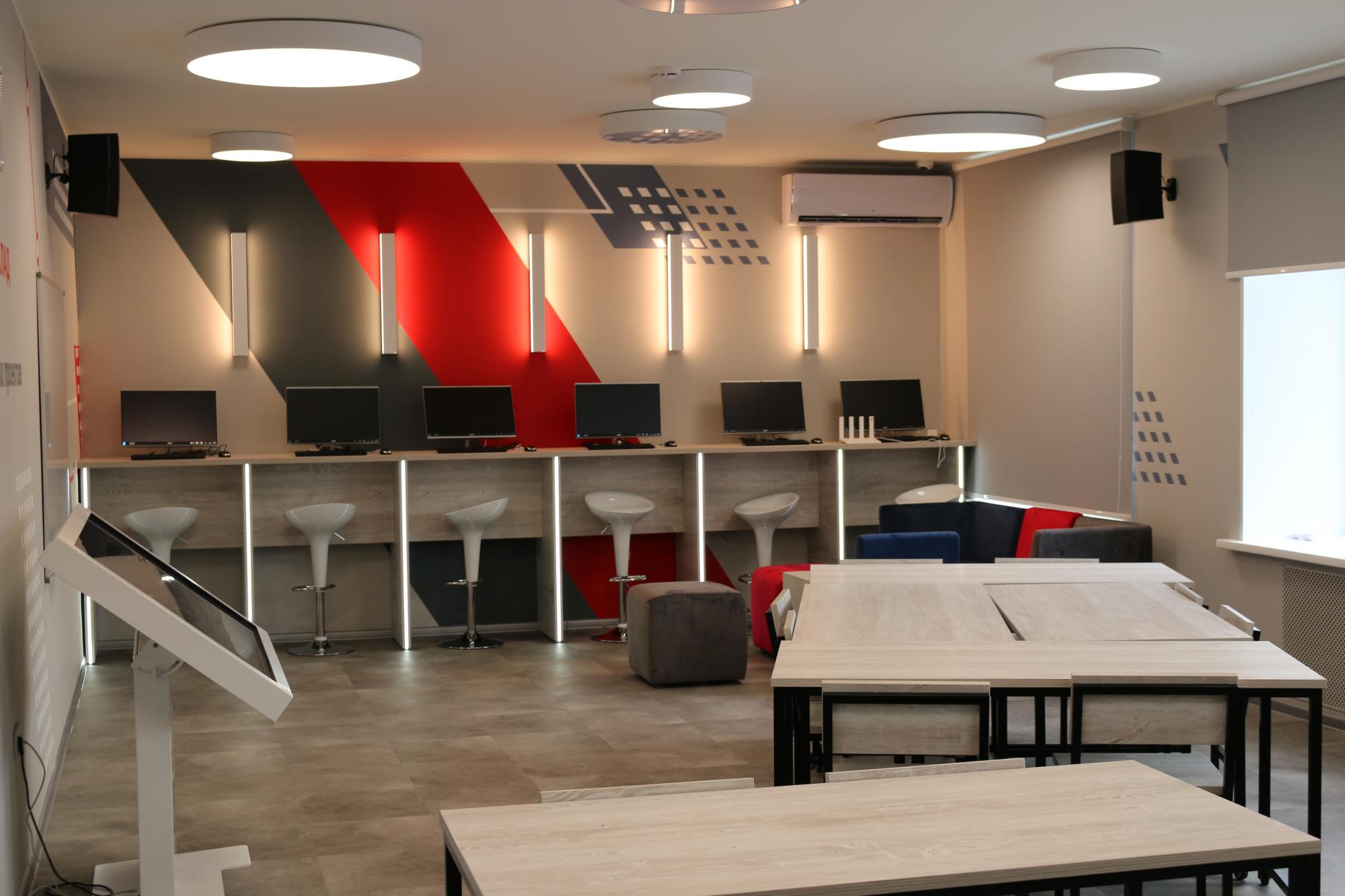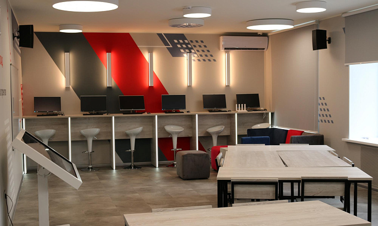 Коворкинг – это зона для взаимодействия и кооперации студентов. Аудитория оснащена удобными диванами, столами, имеются 6 компьютеров и демонстрационная панель с сенсорным вводом.