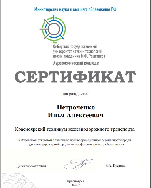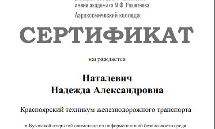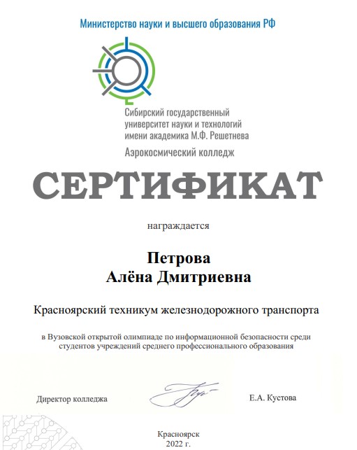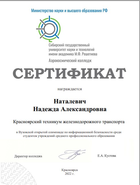 28 января обучающиеся Красноярского техникума железнодорожного транспорта приняли участие в Краевой олимпиаде по информационной безопасности среди студентов СПО на базе ФГБОУ ВО «Сибирский государственный университет науки и технологий имени академика М.Ф. Решетнева». Олимпиада проводилась в дистанционном режиме в форме тестирования. Участникам было предложено выполнение теоретических и практических задач в сфере информационной безопасности. 38 студентов отделений «Базовая подготовка» и «Эксплуатация железных дорог» под руководством преподавателей информатики Путинцевой И.В. и Юманова П.Н. продемонстрировали высокий уровень знаний о способах защиты и сохранения данных. Наибольшее количество баллов набрали: Петроченко Илья, Поручник Шамиль, Щеткова Анастасия, Якина Анастасия, Самарников Сергей, Степаненко Данил, (Д.9-19-4), Наталевич Надежда и Янгулова Альбина (Д.9-19-3), Петрова Алена (Д.9-21-2). Благодарим всех участников за достойное участие в Краевой олимпиаде!