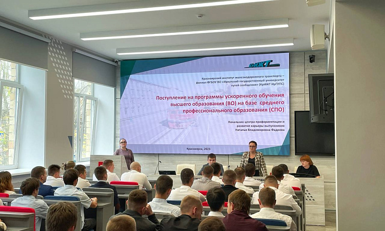 18 октября прошел открытый диалог со студентами выпускного курса СПО специальности «Техническая эксплуатация подвижного состава железных дорог (локомотивы)» с представителями высшего образования КрИЖТ. В диалоге учувствовали заместитель директора по СПО Елена Смиян, начальник ЦПРК Наталья Фадеева, и.о. зав. каф. «Эксплуатация железных дорог» Вячеслав Томилов, и.о. декана факультета заочного отделения Кутузова А.В.