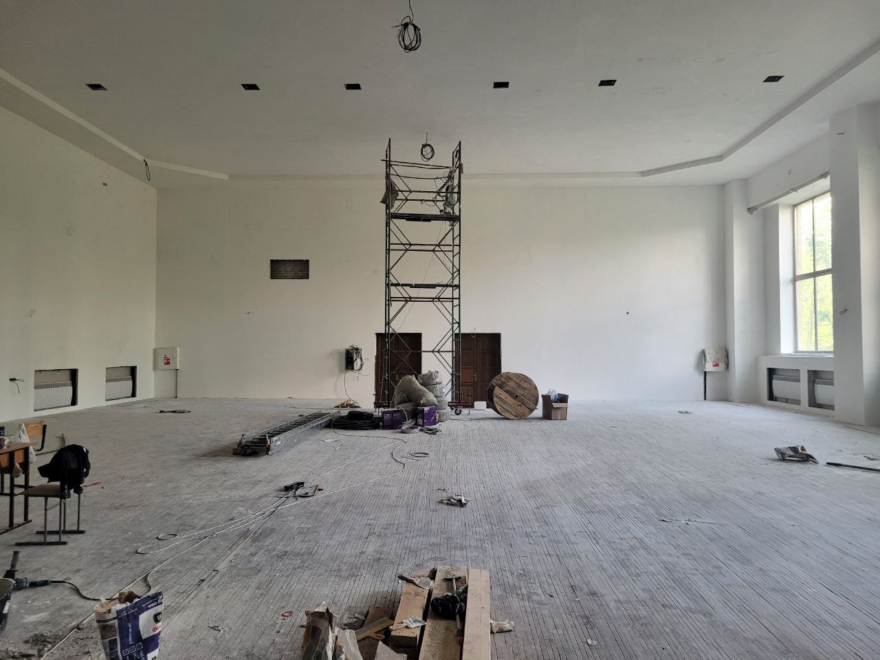 В настоящее время выполнены работы по обшивке стен и колонн гипсокартонными листами, установлены радиаторы отопления, что обеспечит комфортную температуру в помещении во время проведения мероприятий. Подготовлены стены под окраску, это придаст залу свежий и современный вид.