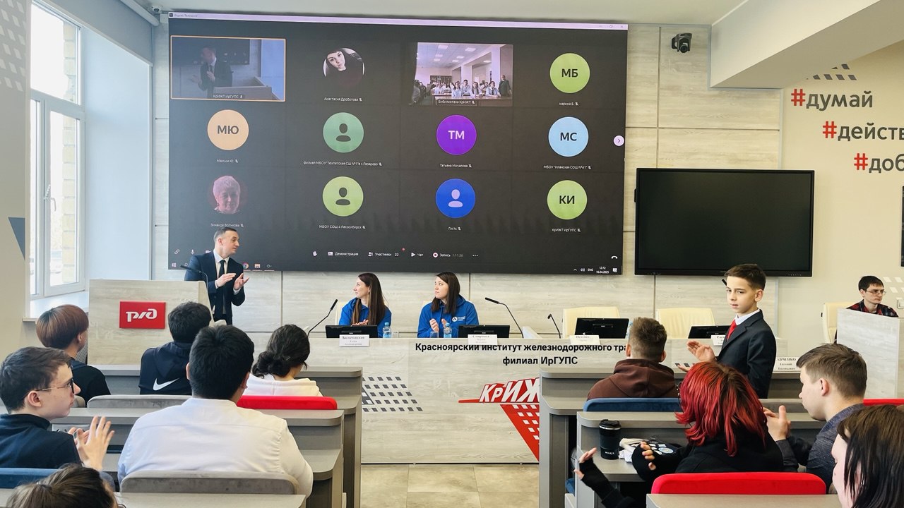 На мероприятии в очном формате присутствовал директор КрИЖТ Евгений Савченко и ещё более ста обучающихся средних образовательных школ и техникумов г. Красноярска.