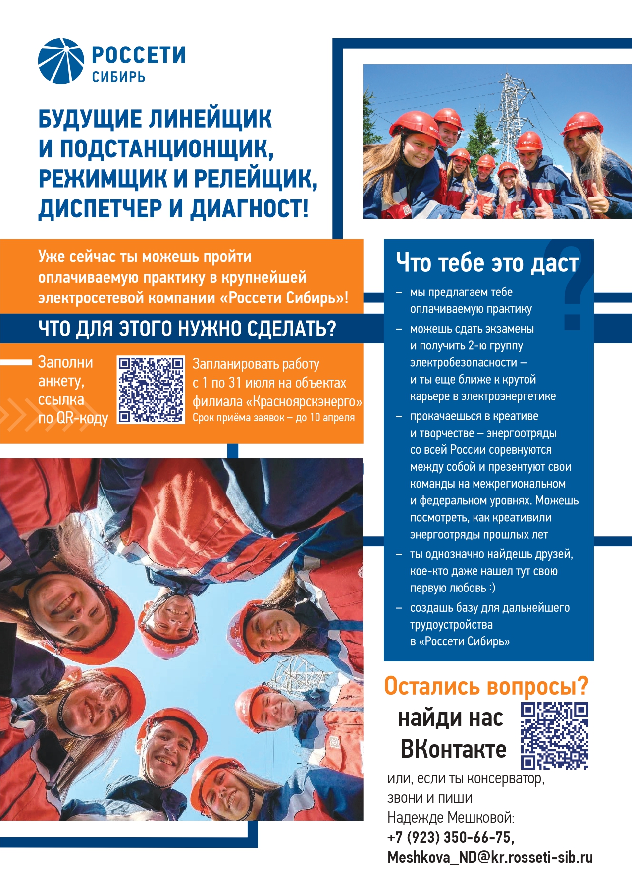 Для участия в Энергоотряде студентам необходимо заполнить анкету на сайте энергоотряд.рф в срок до 10 апреля 2024 года или обратиться к ведущему специалисту сектора подбора и развития персонала Надежде Мешковой тел.:89233506675, е-mail: Meshkova_ND@kr.rosseti-sib.ru