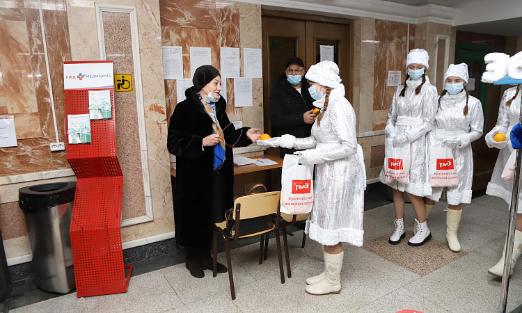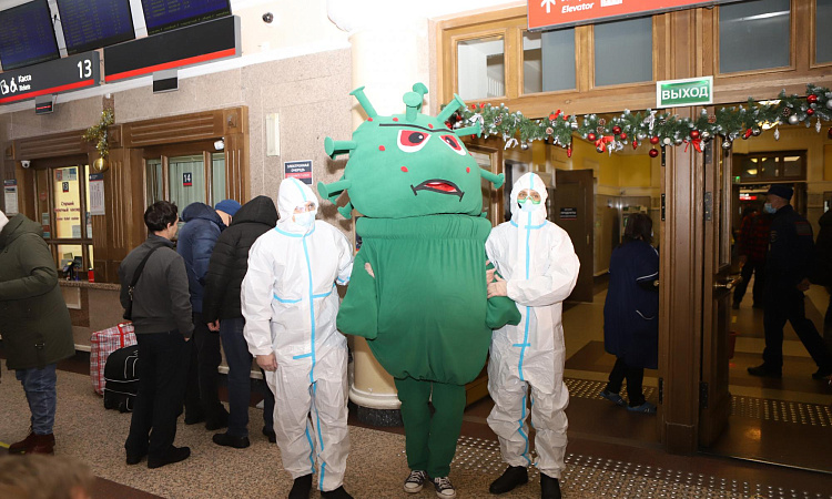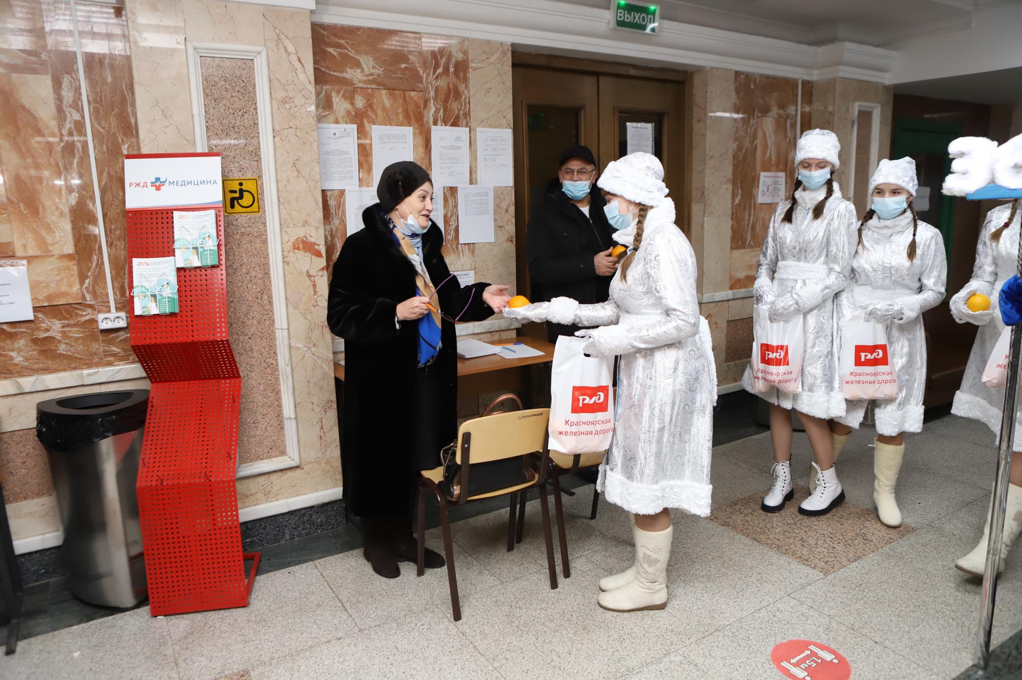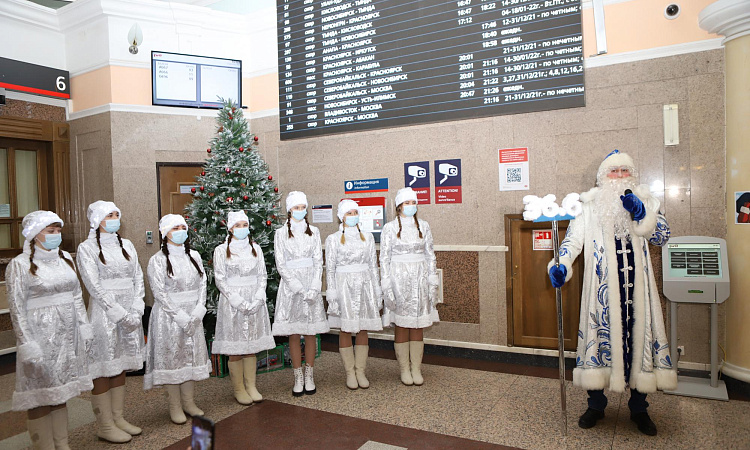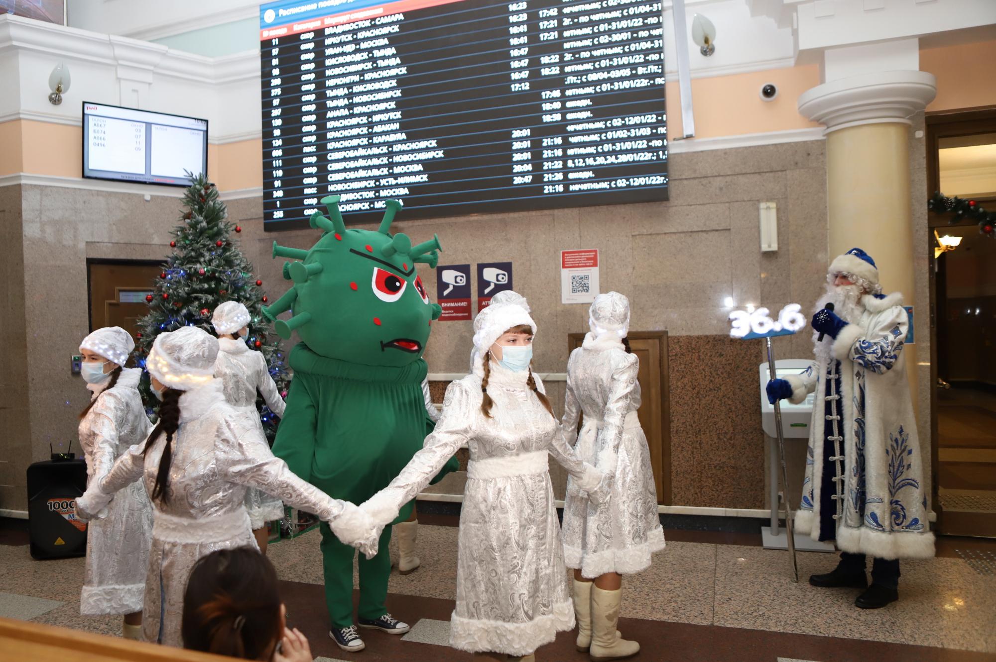 Дед Иммунитет (Дед Мороз) и его помощницы Внучки-антитела (Снегурочки) поздравили с наступающим Новым годом посетителей вокзала Красноярск.