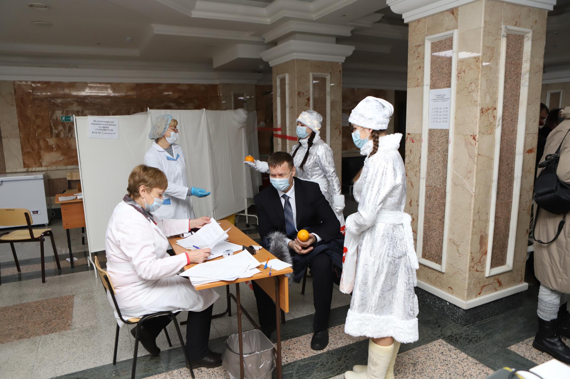 Чтобы поддержать всех, кто уже позаботился о своём здоровье, Дед Иммунитет вместе с Внучками-антителами отправился в прививочный пункт вокзала и поздравил вакцинирующихся красноярцев.
