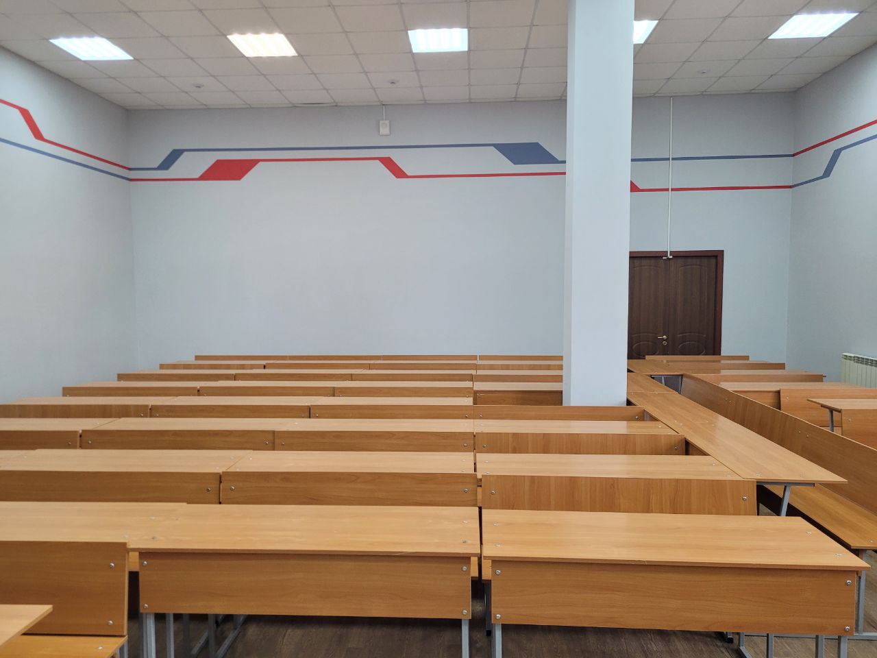 Одним из главных изменений аудитории — это цветовое решение стен. Теперь они окрашены в благородный серый цвет, который придает помещению элегантность и спокойствие. Серый — это универсальный цвет, который не вызывает излишнего напряжения и не отвлекает внимание, позволяя студентам лучше сконцентрироваться на учебе. Психологически серый ассоциируется с интеллектом, стабильностью и профессионализмом, что способствует созданию подходящей образовательной атмосферы.