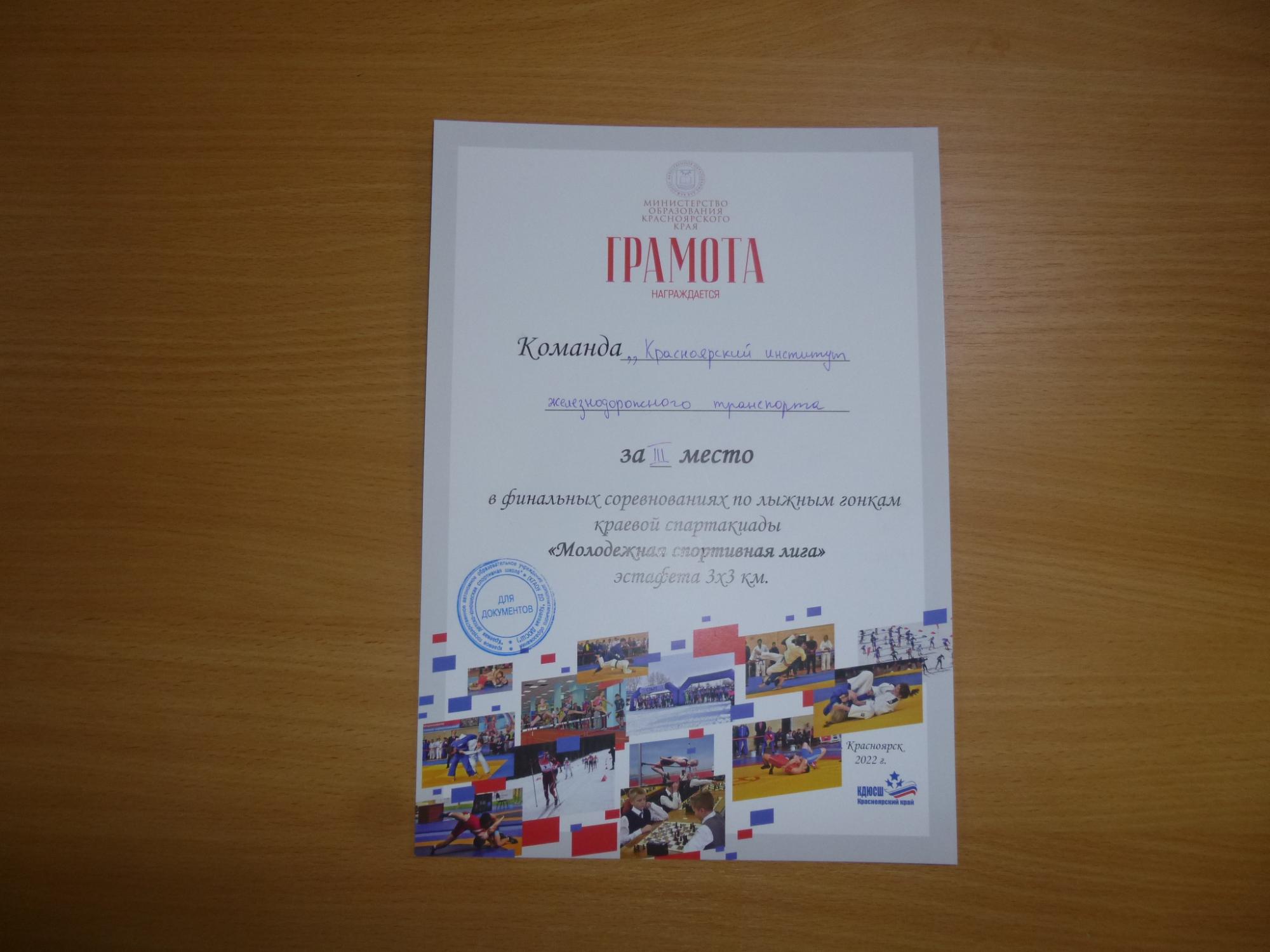 3-4 февраля 2022 года на стадионе «Академия биатлона», состоялись соревнования первенство Красноярского края по лыжным гонкам «Молодежная спортивная лига», в которых приняли участие студенты КрИЖТ ИрГУПС, где наша команда заняла общекомандное 4 место из 19 команд Красноярского края.