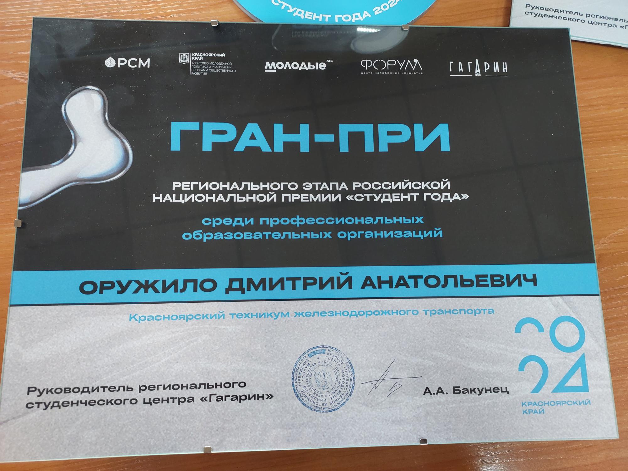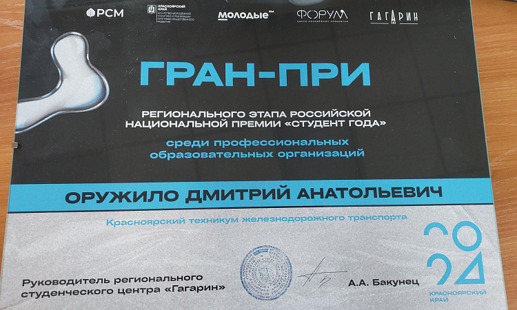 Поздравляем нашего студента Оружило Дмитрий группы ЭПСл.11-22-5, который стал обладателем: ГРАН-ПРИ среди профессиональных образовательных организаций, а также стал лауреатом 1 степени в номинации «Профессионал года» среди профессиональных образовательных организаций.