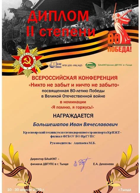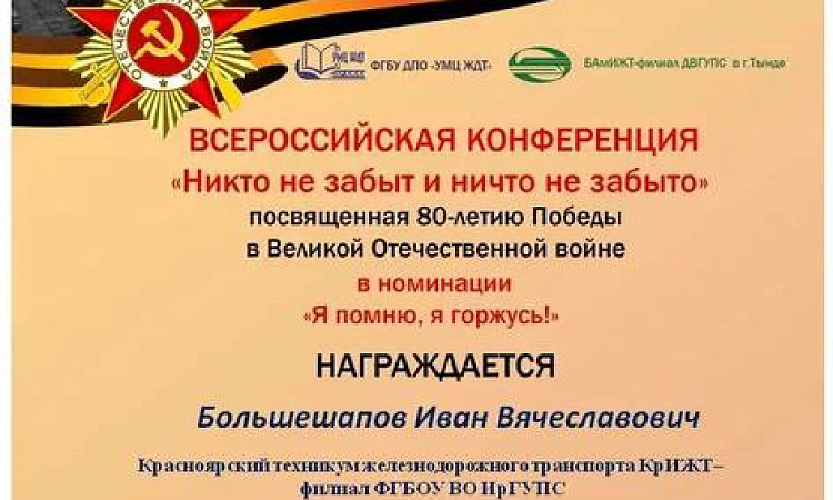 В номинации "Я помню, я горжусь» II место занял студент Красноярского техникума железнодорожного транспорта Большешапов И., гр. ЭПСл 9-24-4 (руководитель - Ацепаева М.Б.).