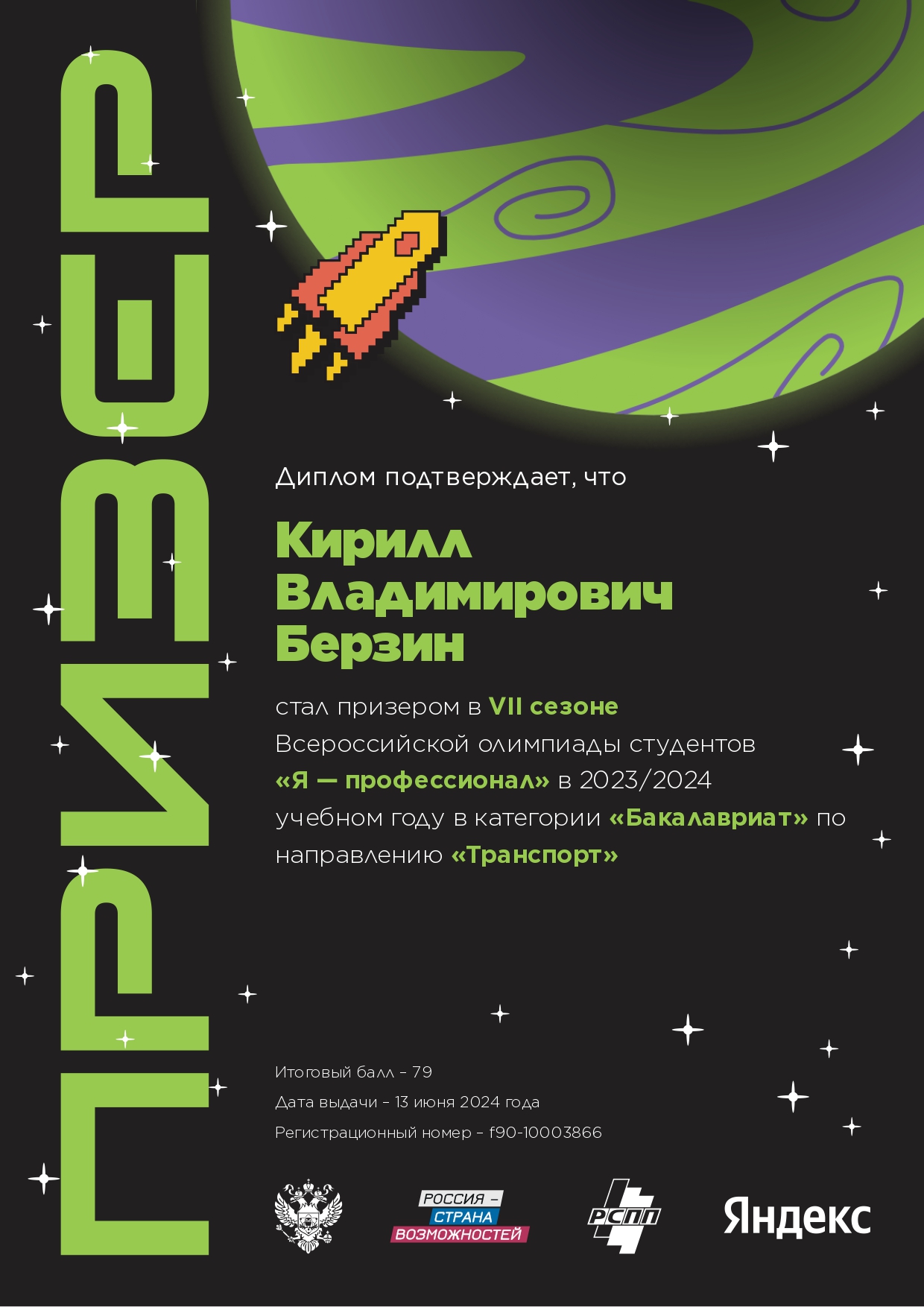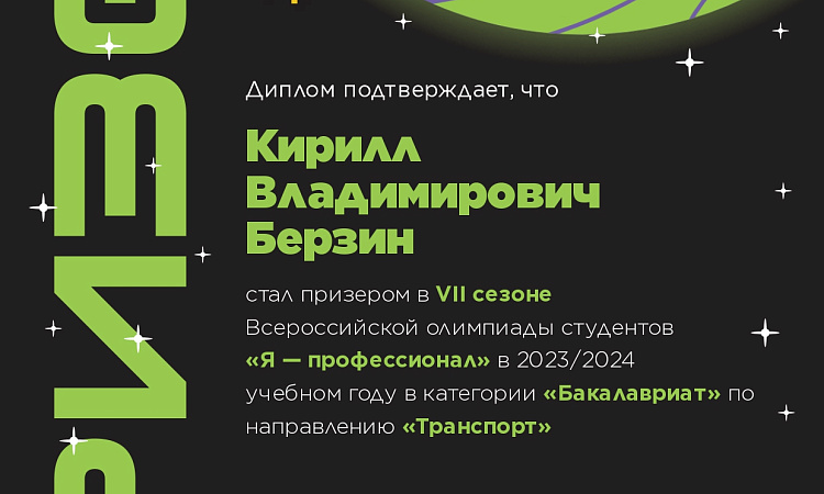 Впервые студент КрИЖТ ИрГУПС (Берзин Кирилл) стал призером в VII сезоне Всероссийской олимпиады студентов «Я — профессионал» по направлению «Транспорт».