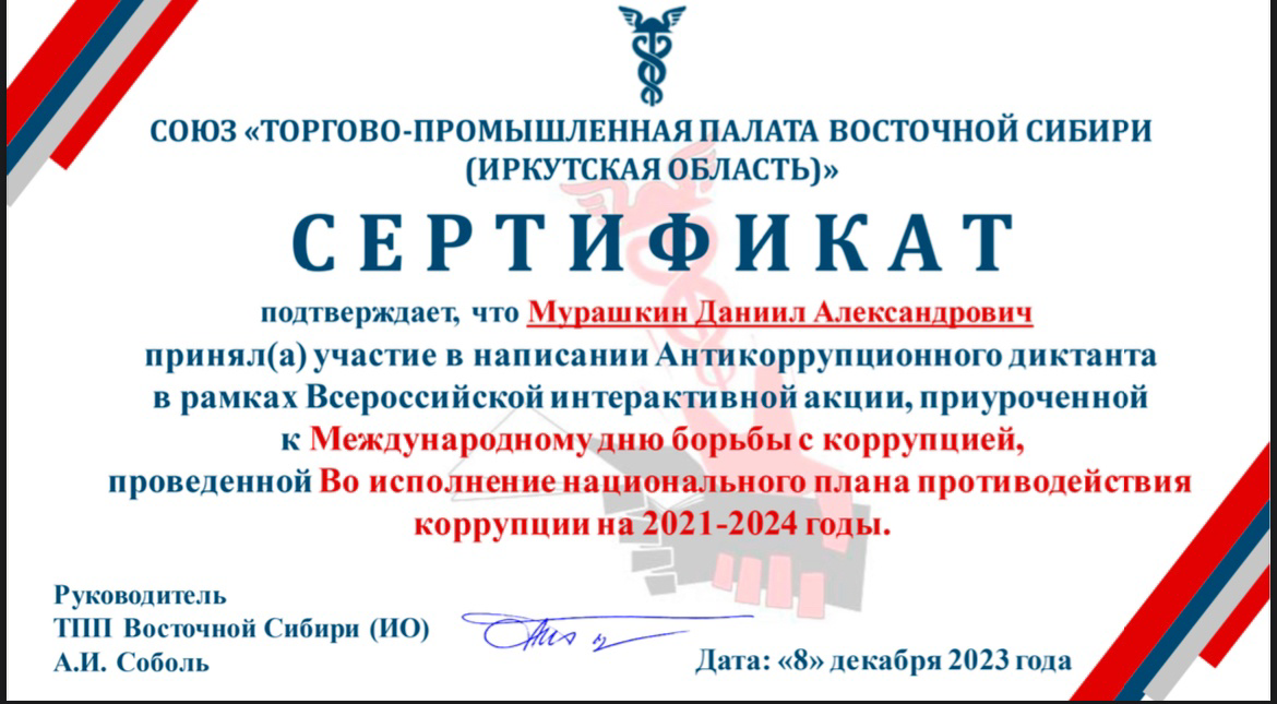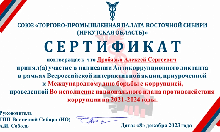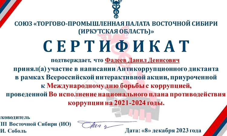 В рамках Акции были представлены итоги XI этапа специального исследования Торгово-промышленной палаты РФ «Бизнес-Барометр Коррупции», а также проведен антикоррупционный диктант, который позволил своим участникам проверить свои знания в сфере антикоррупционного законодательства и антикоррупционной политики. Студенты получили сертификаты участия в Акции.