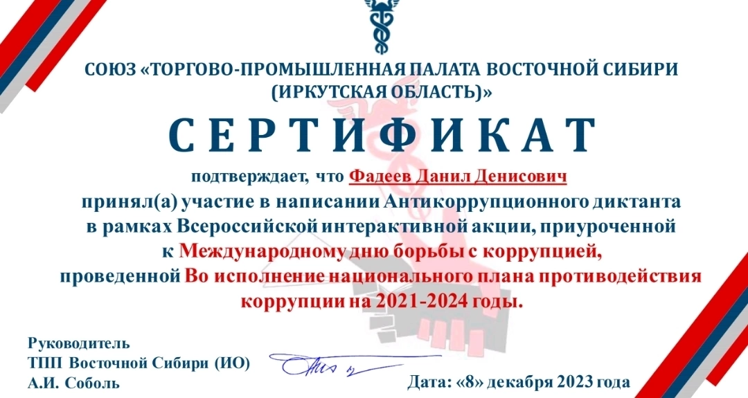 8 декабря студенты групп Э.5-20-1, Э.9-22-1, СОД.1-20-1 и СОД.2-20-1 под руководством ст. преподавателя кафедры «Управление персоналом» Захаровой Е.Н. приняли участие во Всероссийской интерактивной акции, приуроченной к Международному дню борьбы с коррупцией.