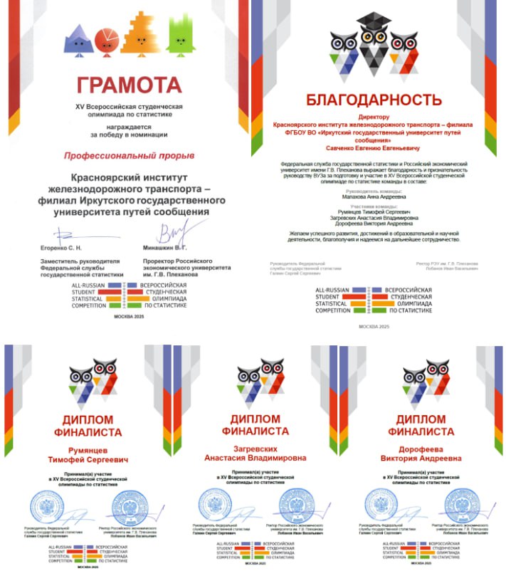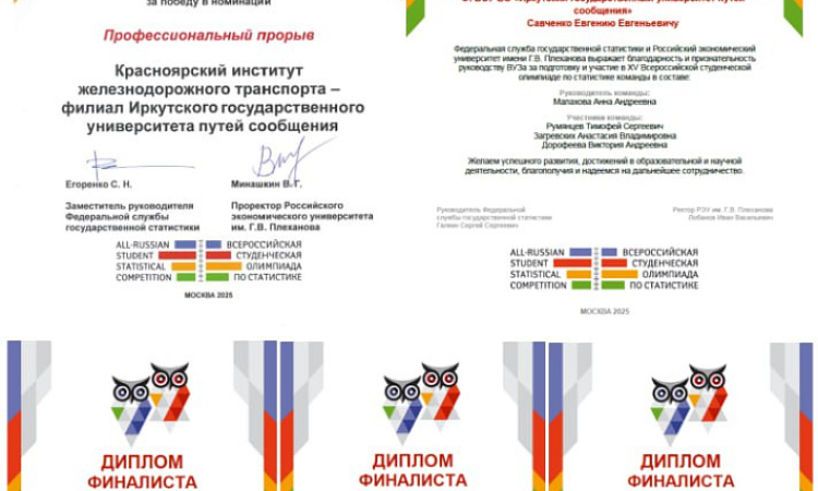 Пройдя несколько сложных этапов, включающих индивидуальный зачет и научно-исследовательскую командную работу, наши ребята вышли в финал и стали победителями в номинации «Профессиональный прорыв». Руководитель Федеральной службы государственной статистики Галкин Сергей Сергеевич и ректор РЭУ им. Г.В. Плеханова Лобанов Иван Васильевич выражают благодарность и признательность директору Красноярского института железнодорожного транспорта Савченко Евгению Евгеньевичу и руководству вуза за подготовку участников и сотрудничество в научной и образовательной деятельности.