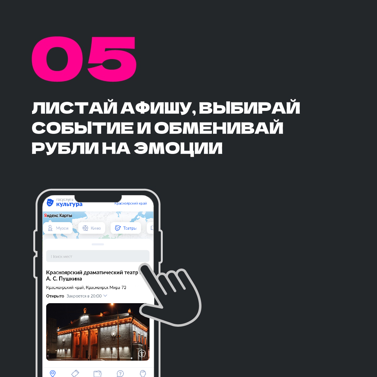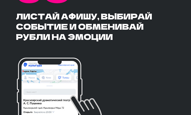 5. Оплатить «Пушкинской картой» билет. Большой выбор мероприятий - театры, музеи, филармония, кинотеатры, культурно-досуговые учреждения, библиотеки и выставочные залы.