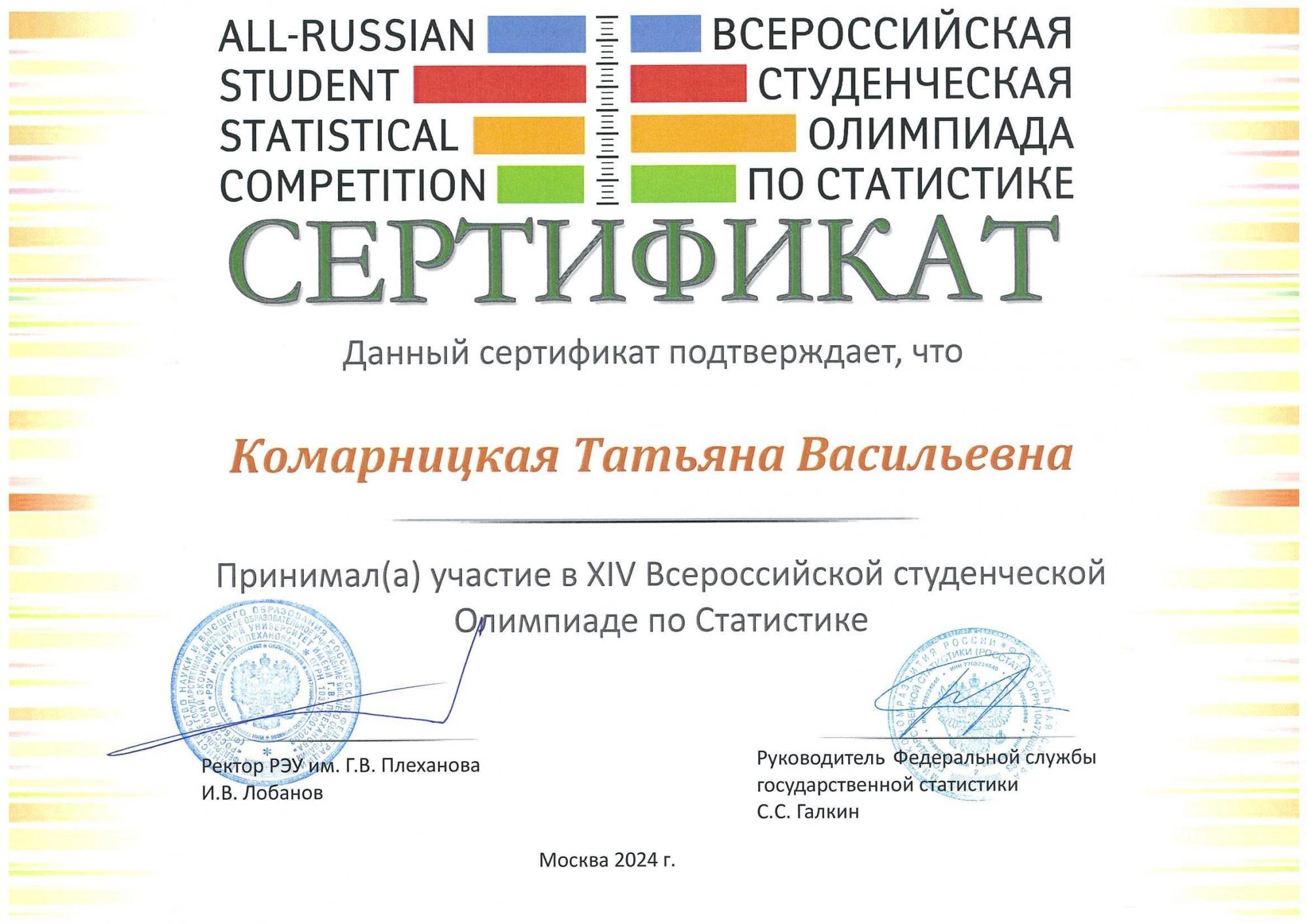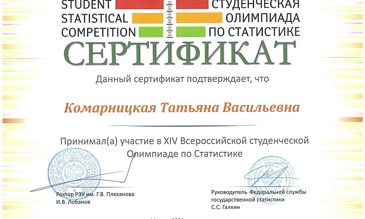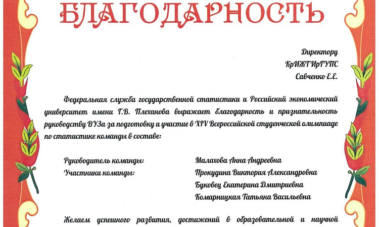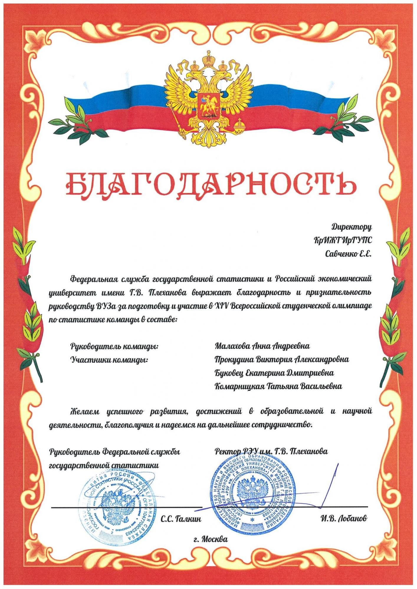 За успешное представление докладов на конкурс научных работ и прохождение отборочного этапа, команда КрИЖТ отмечена сертификатами участников и благодарственным письмом директору КрИЖТ от руководителя Федеральной службы по статистике и ректора Российского экономического университета им. Г.В. Плеханова.