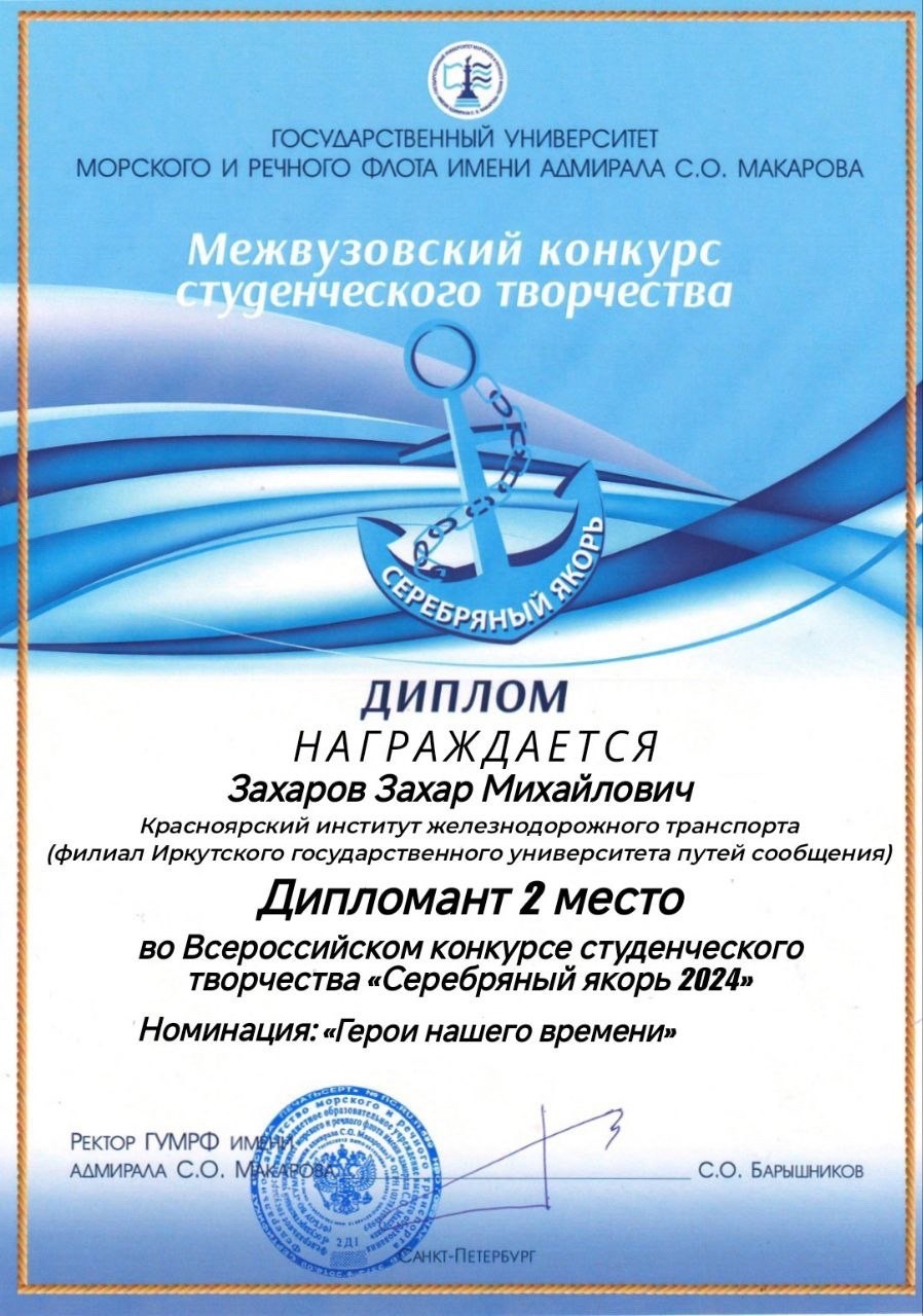 И наконец-то нам пришли долгожданные результаты. По завершению конкурса все студенты КрИЖТ получили сертификаты участников, а Мезенцева Эльвира (группа С.9-23.2) и Захаров Захар (группа СОД.1-20-1) были удостоены звания лауреатов II степени.