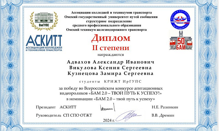 Поздравляем студентов группы М 9-22-1 с заслуженным вторым местом во Всероссийском конкурсе агитационных видеороликов «БАМ 2.0-Твой путь к успеху!»