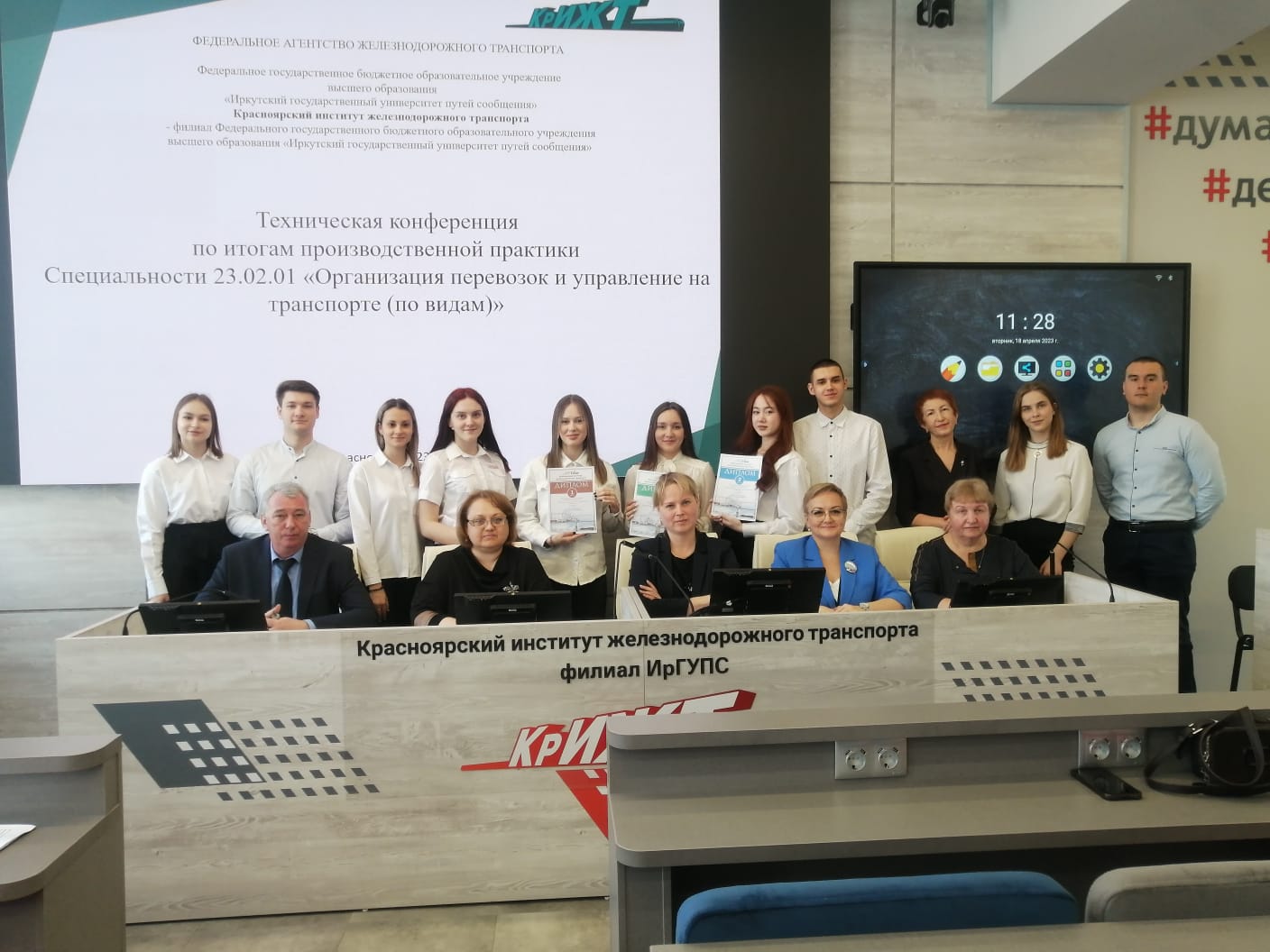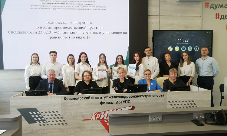 18 апреля в Красноярском техникуме железнодорожного транспорта КрИЖТ ИрГУПС прошла техническая конференция по итогам производственной практики на специальности 23.02.01 «Организация перевозок и управление на транспорте». На неё были приглашены представители Красноярской железной дороги: ведущий инженер по подготовке кадров Красноярской ДУД Ксения Мех и ведущий инженер по подготовке кадров Красноярского ДЦС Наталья Юдина, а также студенты-первокурсники. Выпускники представили свои доклады о прохождении производственной практики, поделились опытом работы с наставниками, рассказали с какими трудностями столкнулись за время прохождения практики и ответили на вопросы первокурсников о том, каким образом удавалось справляться с поставленными задачами.