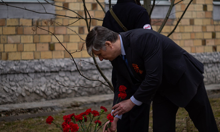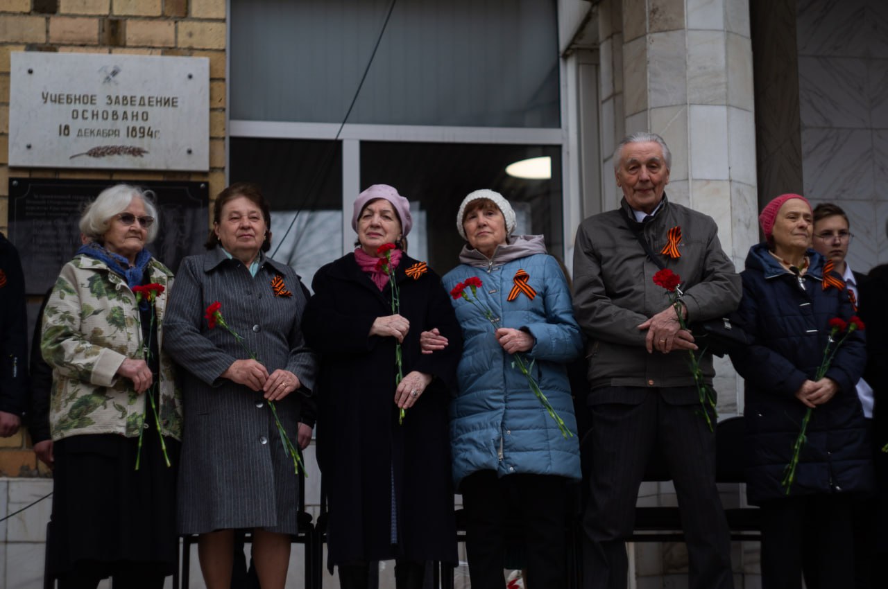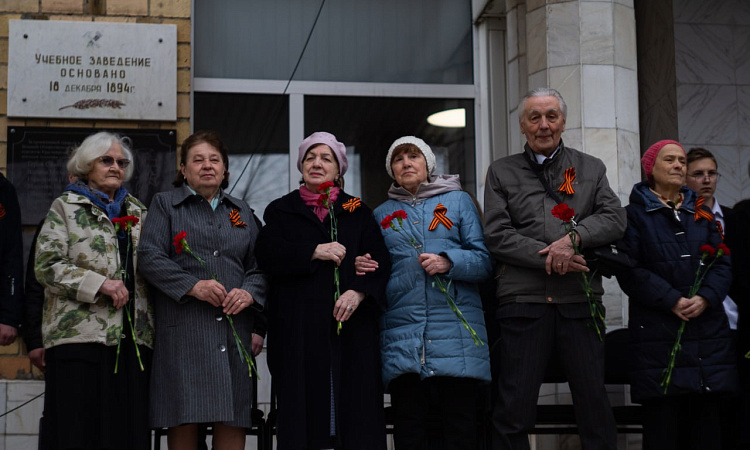 На митинге состоялось возложение цветов к Памятному камню в честь курсантов Школы военных техников, участников ВОВ. Эта миссия была предоставлена почетной группе, состоявшей из ветеранов института: «Ветеранов Труда», «Детей войны», а также представителей администрации института, возглавляемой директором КрИЖТ Евгением Савченко.