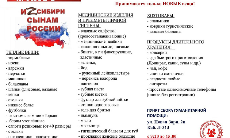 Также сообщаем, что на территории Красноярского края, в рамках проекта «ИZ Сибири сынам России», осуществляется сбор гуманитарной помощи с целью поддержки воинов-красноярцев, призванных на службу в рамках частичной мобилизации.
