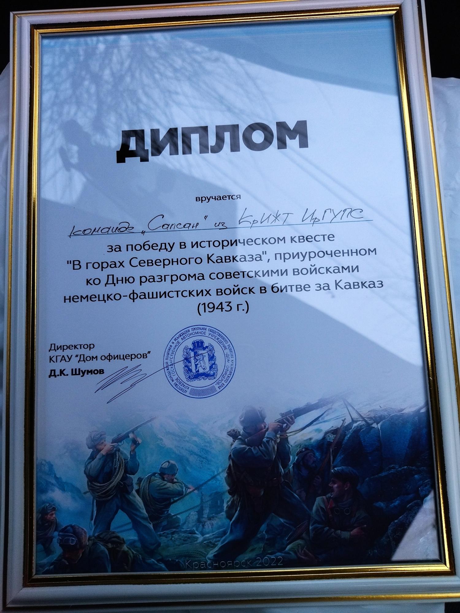 Студенты 1 курса Красноярского техникума железнодорожного транспорта КрИЖТ ИрГУПС группы Д 9-22-1. приняли участие 19 октября 2022 года между командами г. Красноярска в военно – патриотическом квесте «В горах Северного Кавказа» посвященного Дню разгрома советскими войсками немецко-фашистских войск в битве за Кавказ (1943 г.) организованным Краевым государственным автономным учреждением «Дом офицеров».
