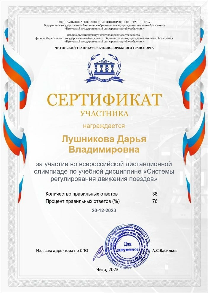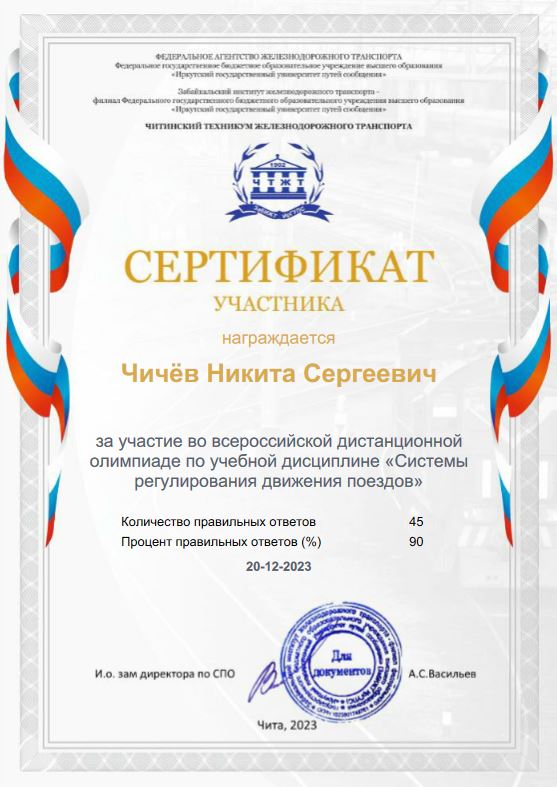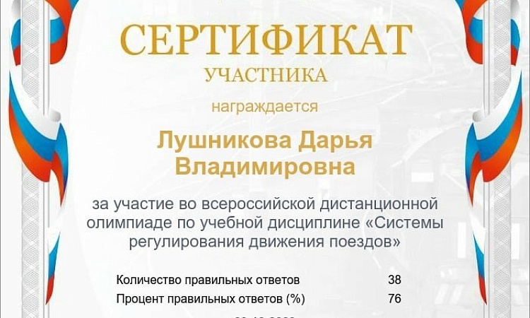 20 декабря студенты Красноярского техникума железнодорожного транспорта специальности «Организация перевозок и управление на транспорте (по видам)», под руководством преподавателя Ярыгиной Ирины Геннадьевны, приняли участие во Всероссийской дистанционной олимпиаде по учебной дисциплине «Системы регулирования движения поездов».