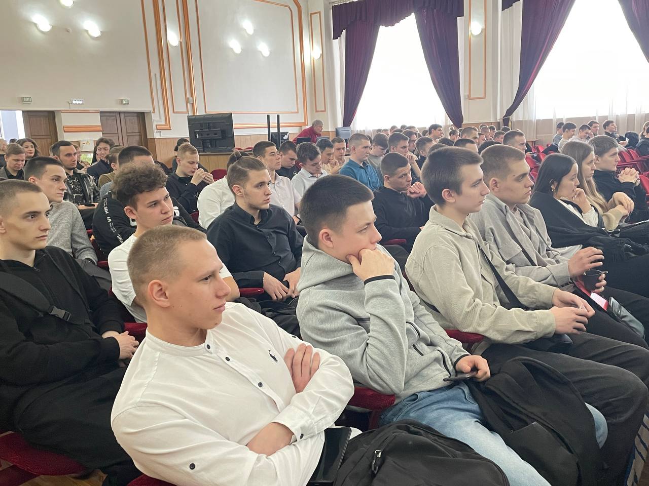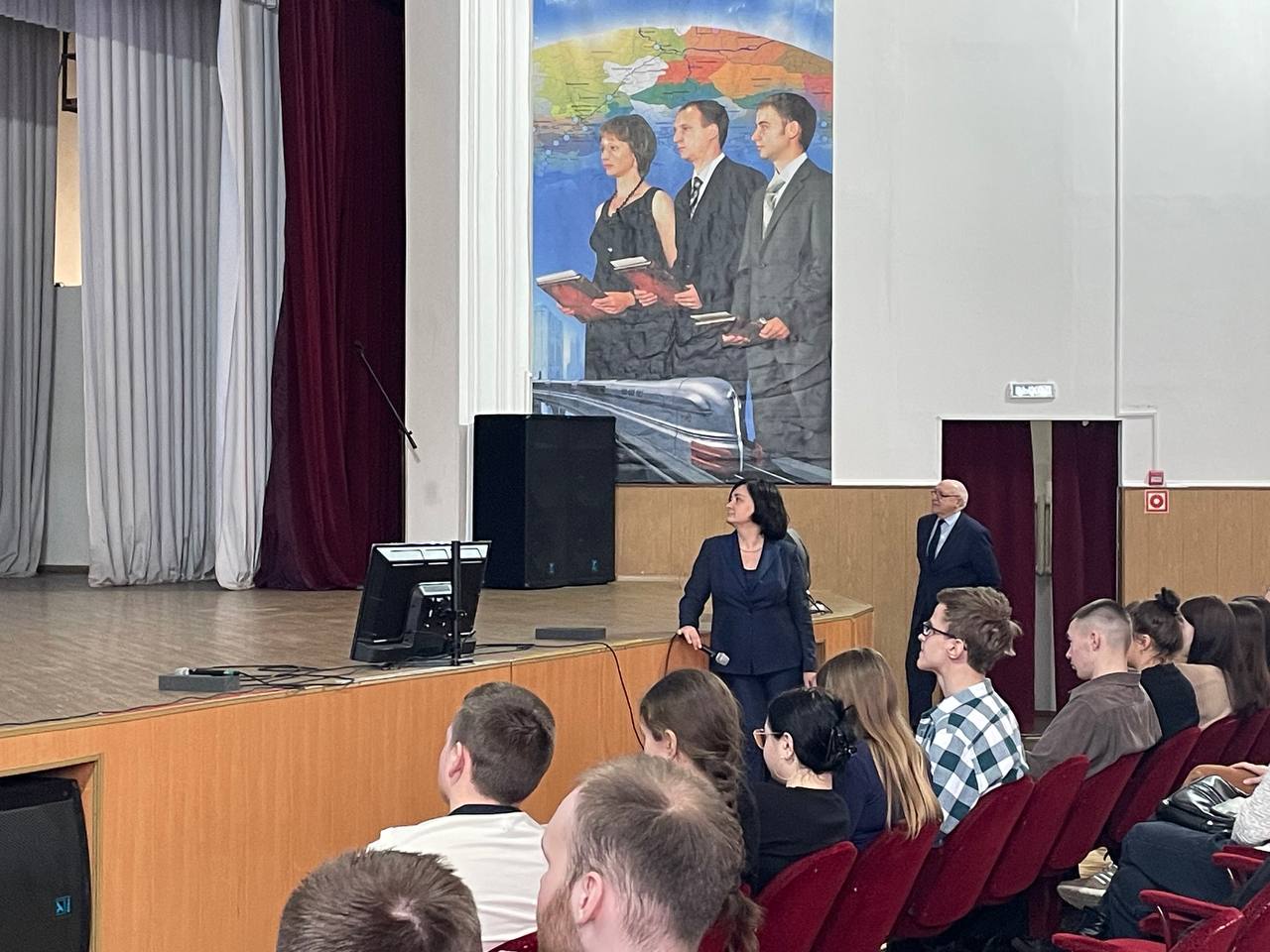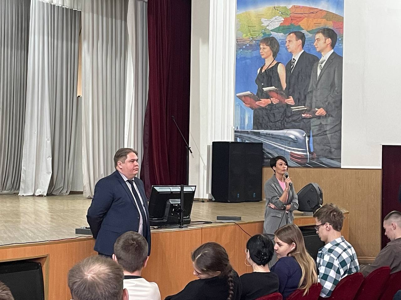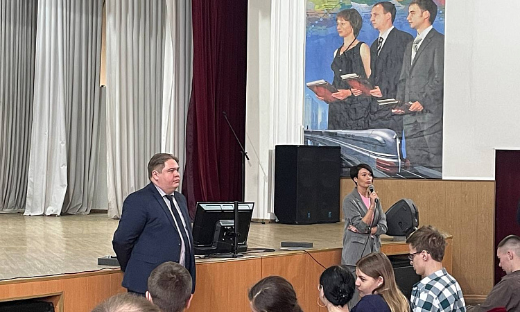 Перед студентами выступили участники прошлогоднего третьего трудового семестра Михаил Раздобарин (гр. СЖД 2-22-1) и Иван Лукин (гр. СОД 2-20-1). Они поделились опытом участия в проекте в 2023 году. Рассказали о своих положительных впечатлениях и пригласили к участию в новом сезоне остальных студентов.