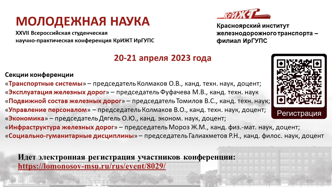 В КрИЖТ ИрГУПС будет проходить XXVII Всероссийская студенческая научно-практическая конференция «Молодежная наука». Конференция «Молодёжная наука» проводится среди обучающихся высших и средних учебных заведений, а также общеобразовательных заведений с целью формирования научно-технического, инновационного и творческого потенциала обучающихся в соответствии с перспективными тенденциями развития железнодорожной отрасли, а также вовлечения их в публикационную активность по результатам научной деятельности.
