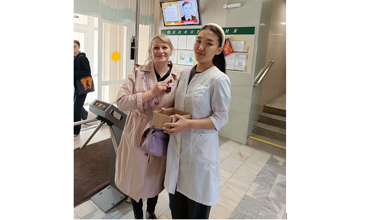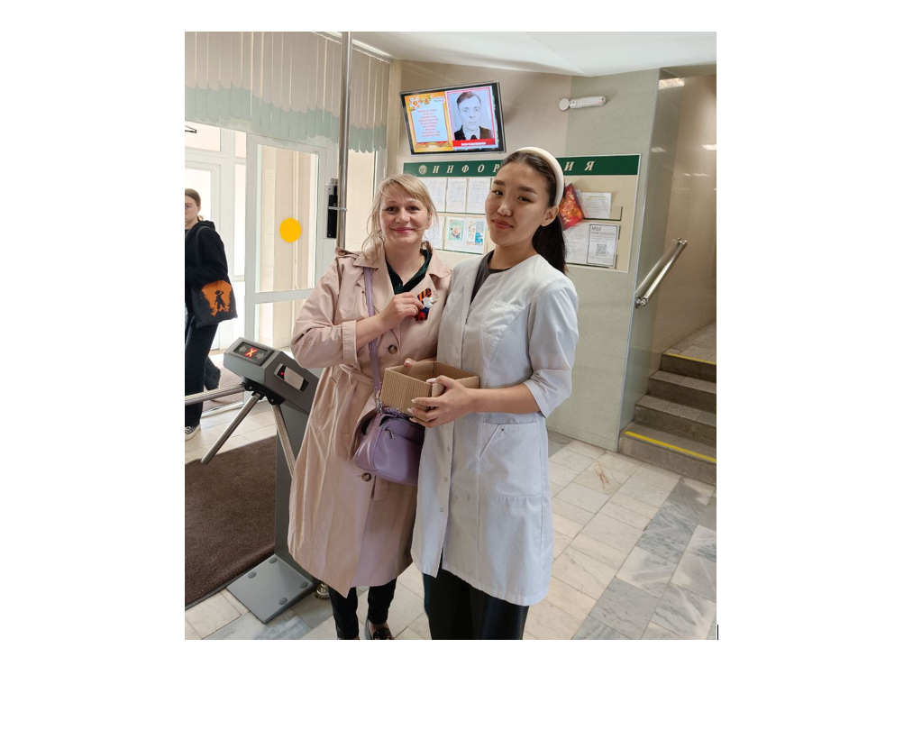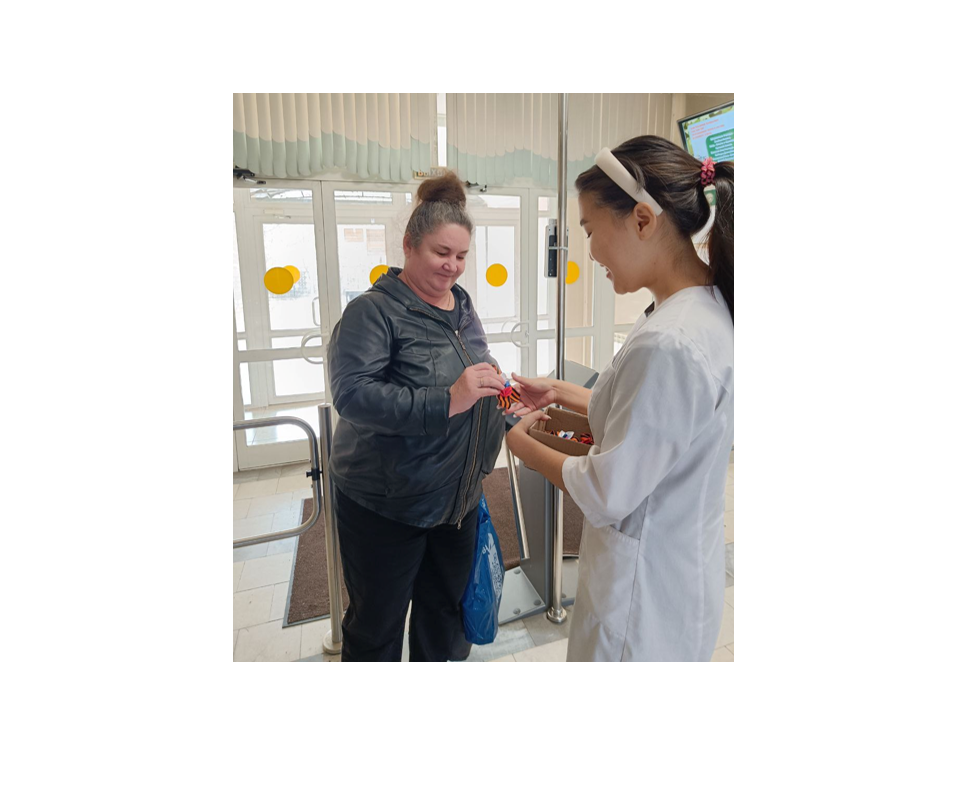 Студенты группы СО.11-22-1 встречали на входе и раздавали георгиевские ленточки, которые очень красиво оформили студенты общежития.