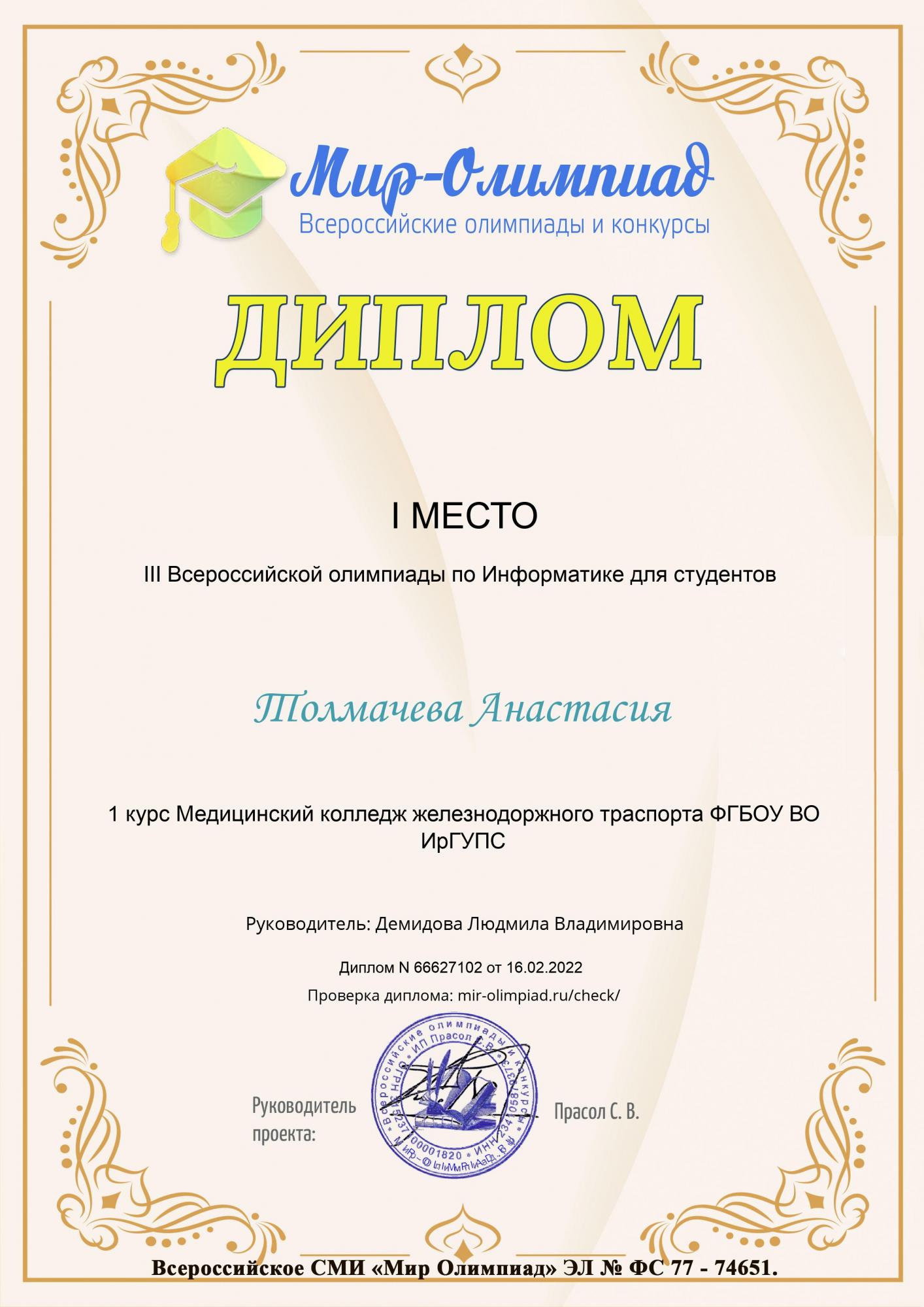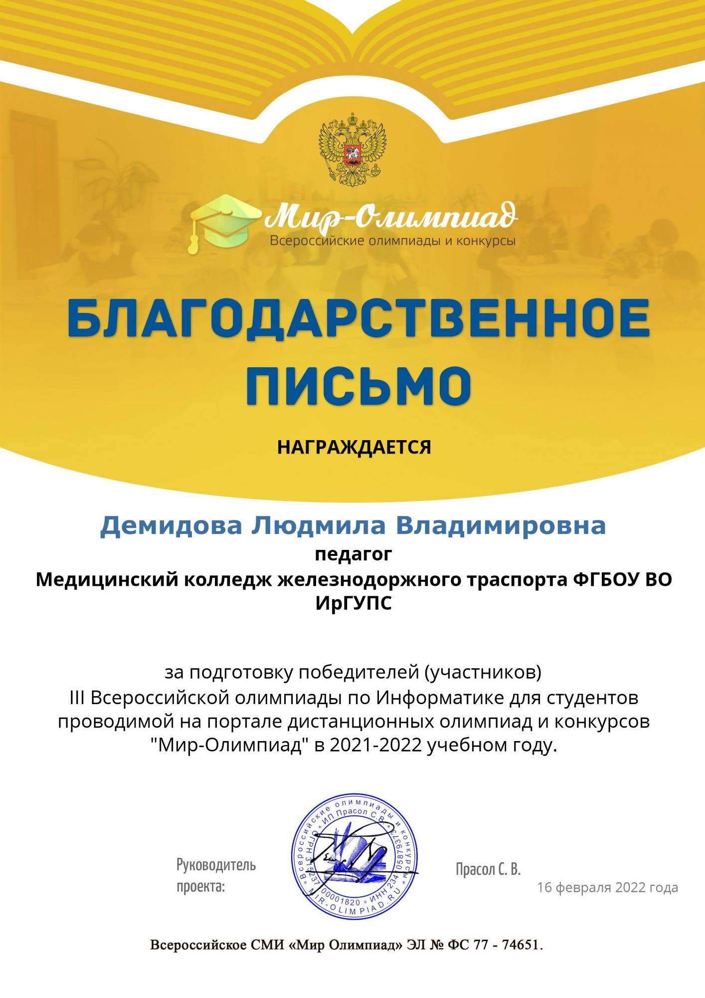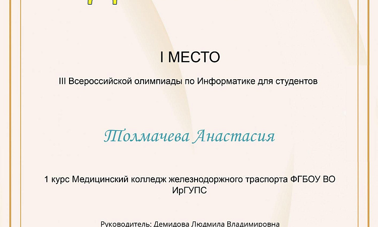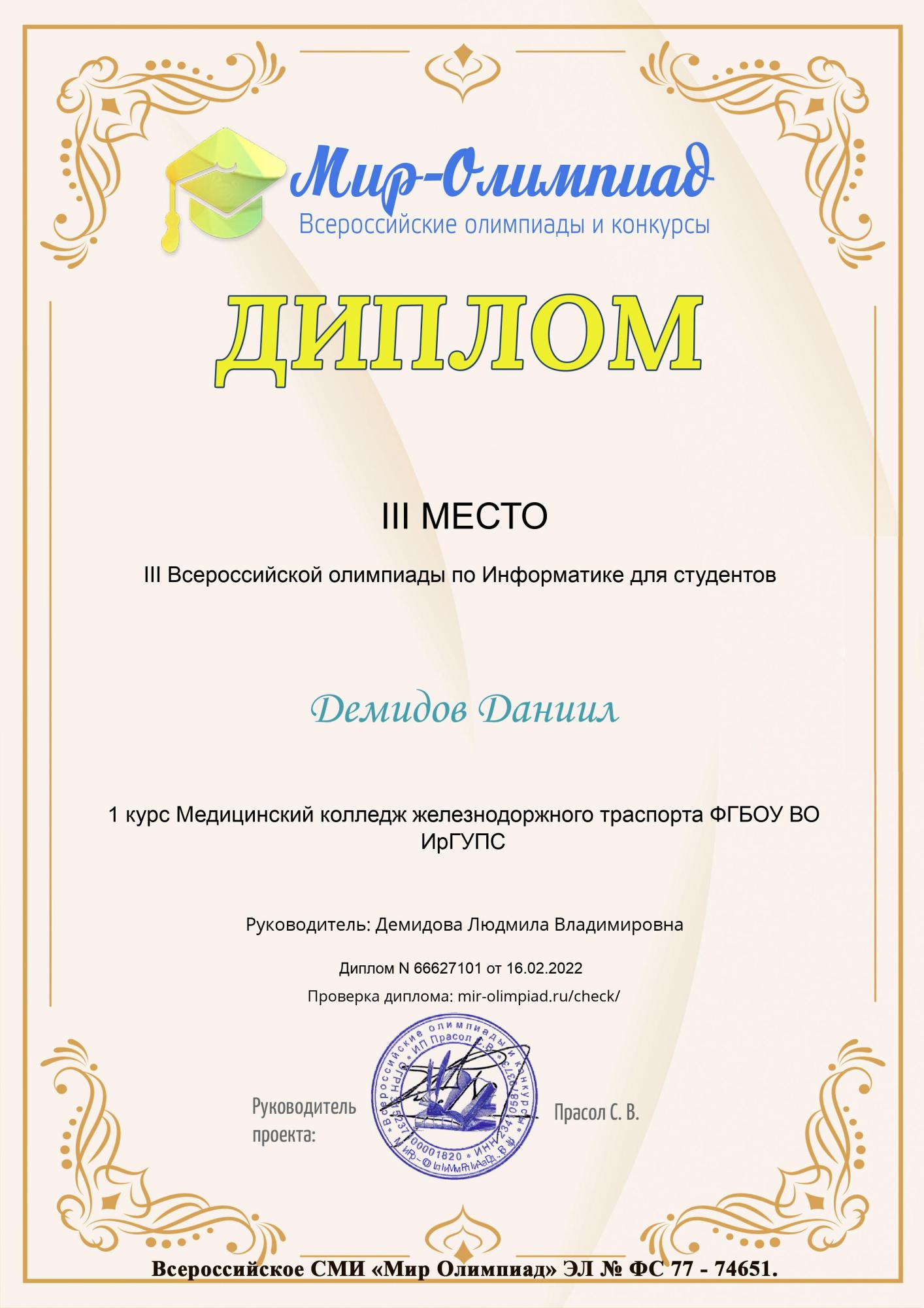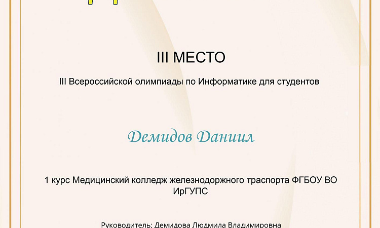 Студенты группы СО.11-21-1(И,О) Демидов Даниил и Толмачева Анастасия под руководством преподавателя Демидовой Л. В. на портале «Мир олимпиад» приняли участие в III Всероссийской олимпиаде по информатике для студентов.