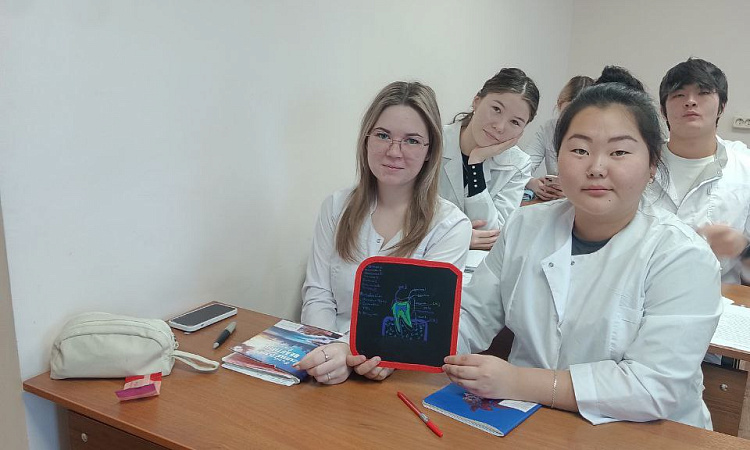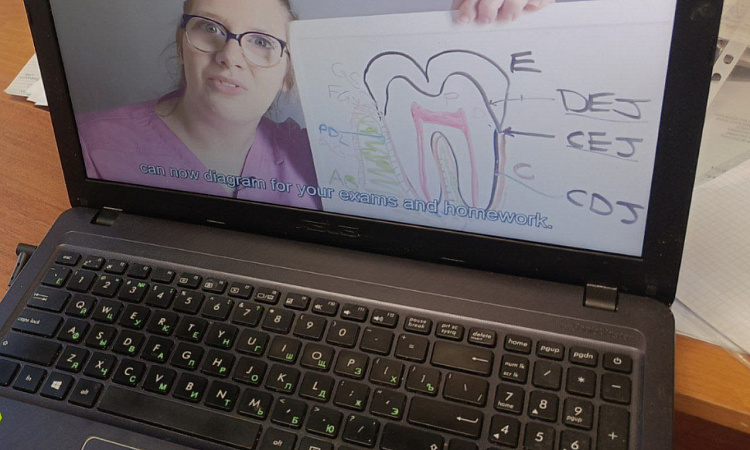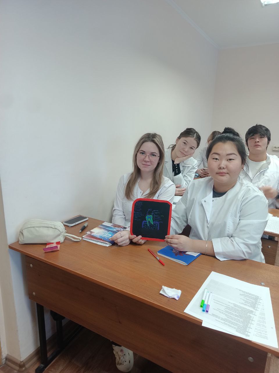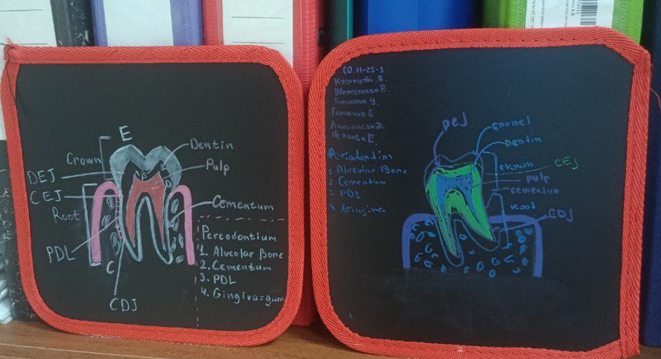 Группа разделилась на две команды, каждая команда получила собственную доску и набор фломастеров. Необходимо было на основе учебного видео на английском языке нарисовать диаграммы по изученному материалу об анатомии зуба.