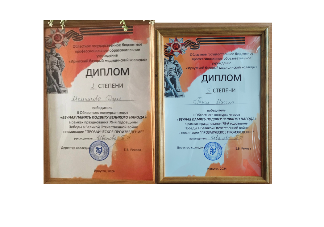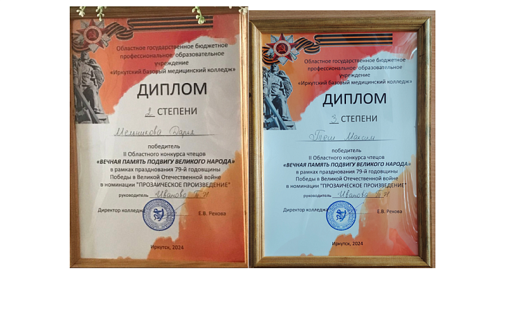 Студенты медицинского колледжа ЖТ Мельникова Дарья и Теш Максим приняли участие в II Областном конкурсе чтецов "Вечная память подвигу великого народа", который прошёл в Иркутском базовом медицинском колледже. В двух номинациях заняли 2 и 3 места!