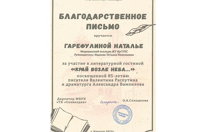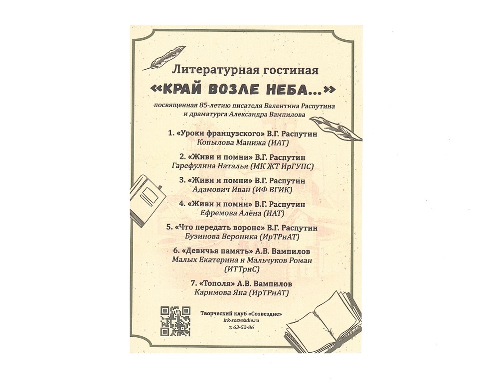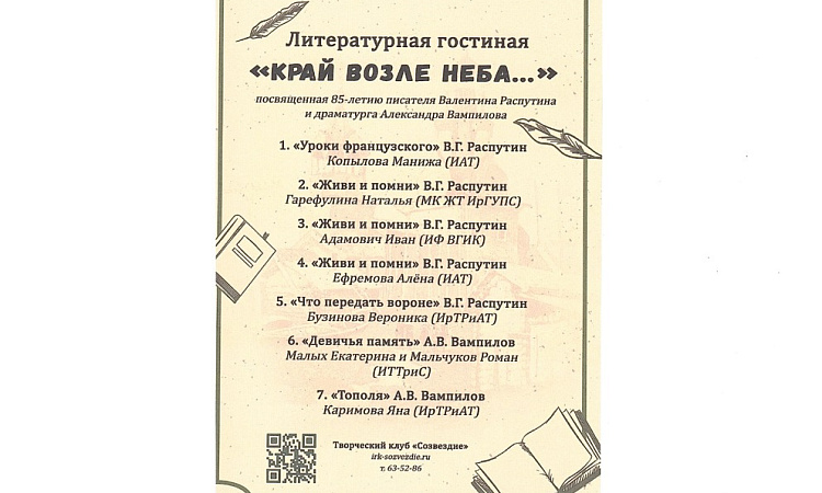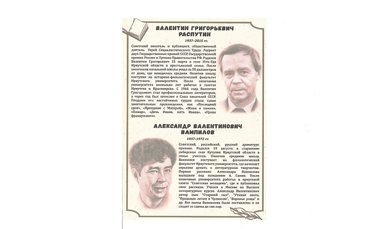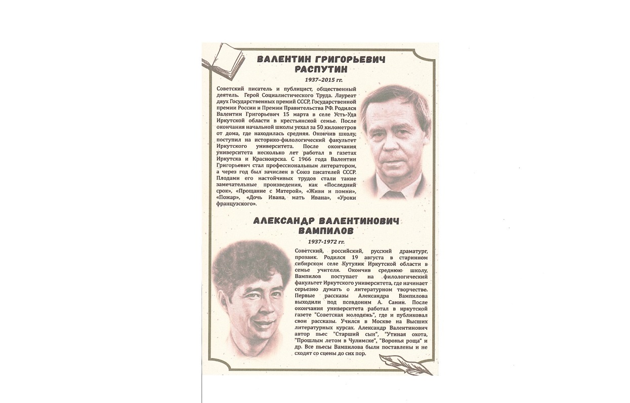 6 октября в библиотеке «Алые паруса», прошла литературная гостиная, посвященная 85-летию писателя Валентина Распутина и драматурга Александра Вампилова «Край возле неба…».