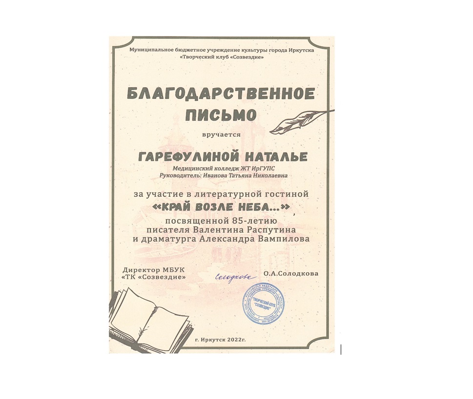 От Медицинского колледжа железнодорожного транспорта приняла участие обучающаяся группы СД.9-21-3 по специальности «Сестринское дело» Гарефулина Наталья.