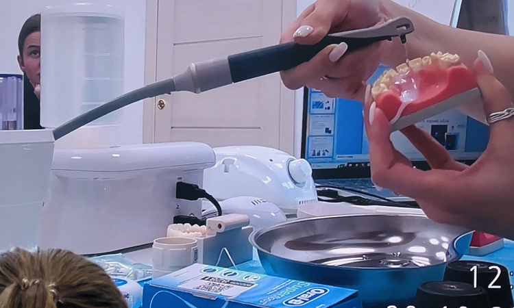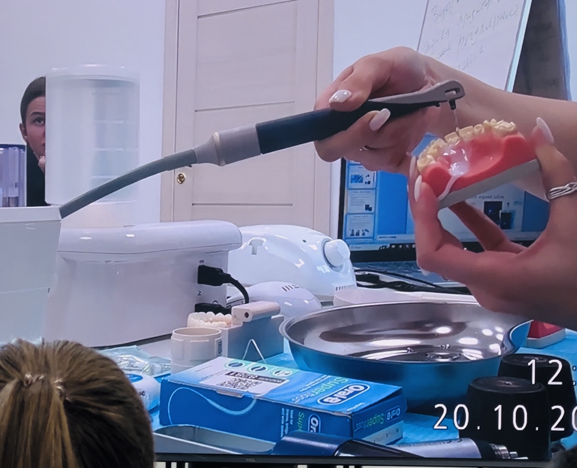 На практической части занятия на фантомах были показаны этапы и последовательность проведения профессиональной гигиены полости с применением ультразвуковых скейлера и аппарата Vector.