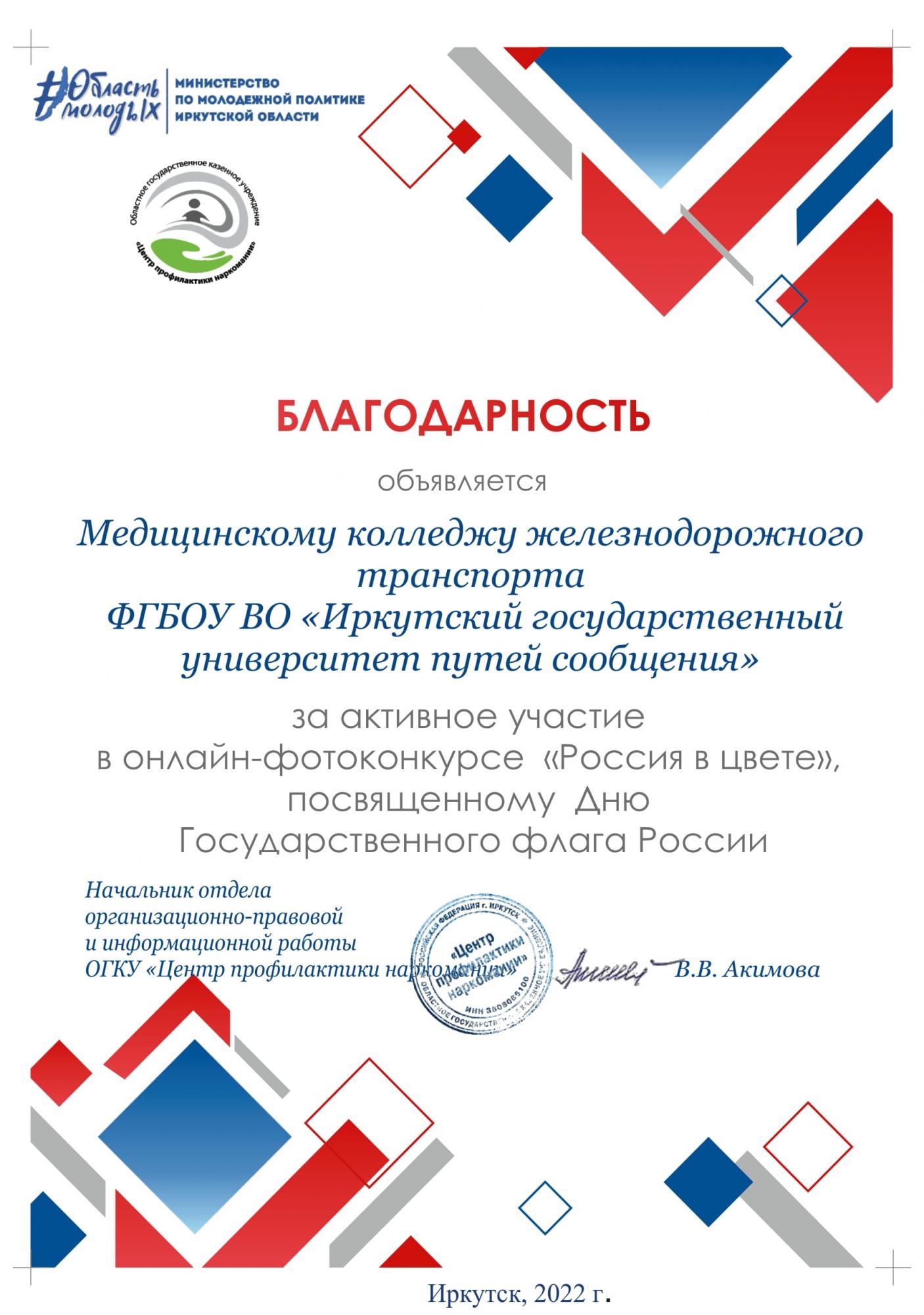 В августе 2022 года Министерством по молодежной политике Иркутской области совместно с Областным государственным казённым учреждением «Центр профилактики наркомании» был объявлен онлайн-фотоконкурс «Россия в цвете», посвященный Дню Государственного флага России.